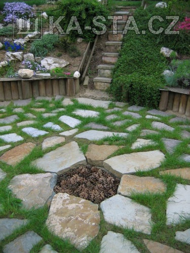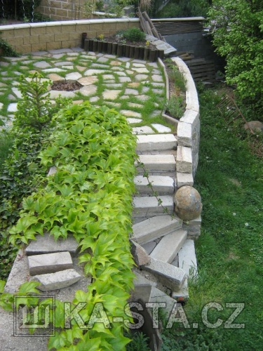 Brno, ul. Jasanová - Suchá zídka, schody, dlažba s ohništěm