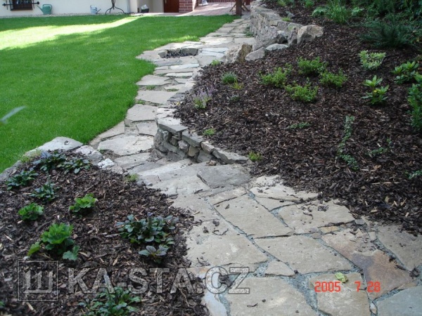 Na zídky jsou použity kameny z původní úpravy zahrady- slepence, droby, diority, granodiority, vápence a další. Dlažba je z moravské droby z horní etáže lomu Luleč.