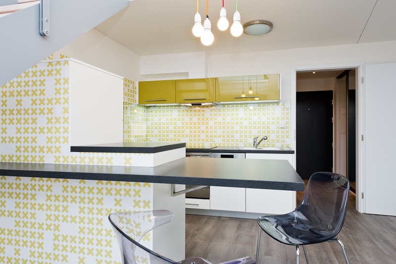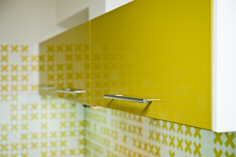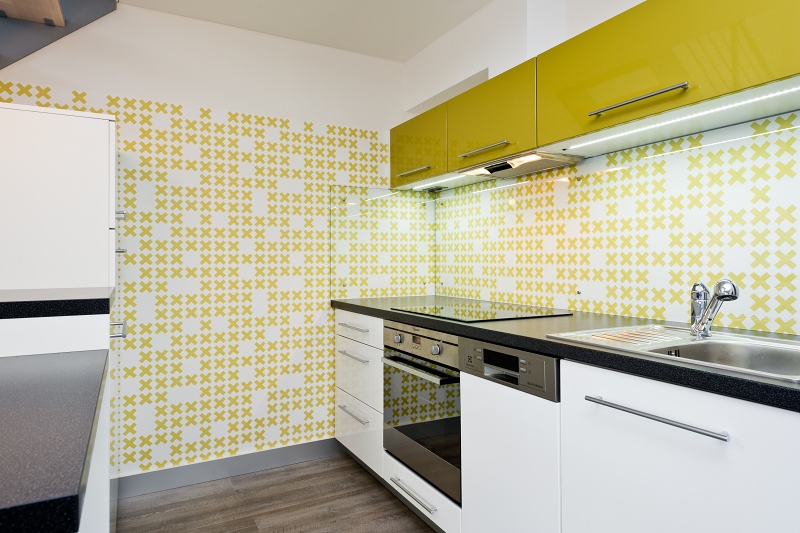Vysoký lesk skříněk v kombinaci se svěží tapetou