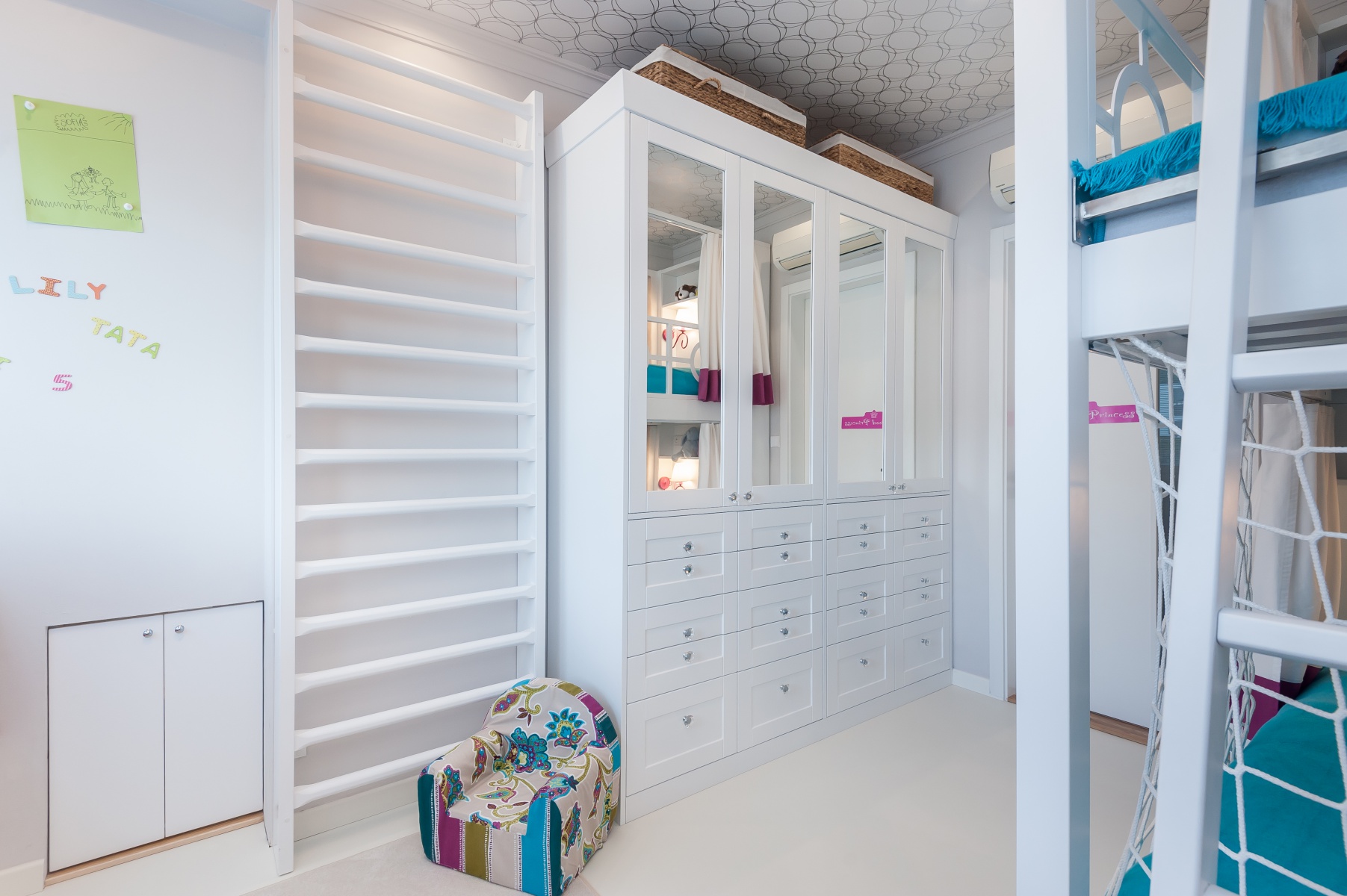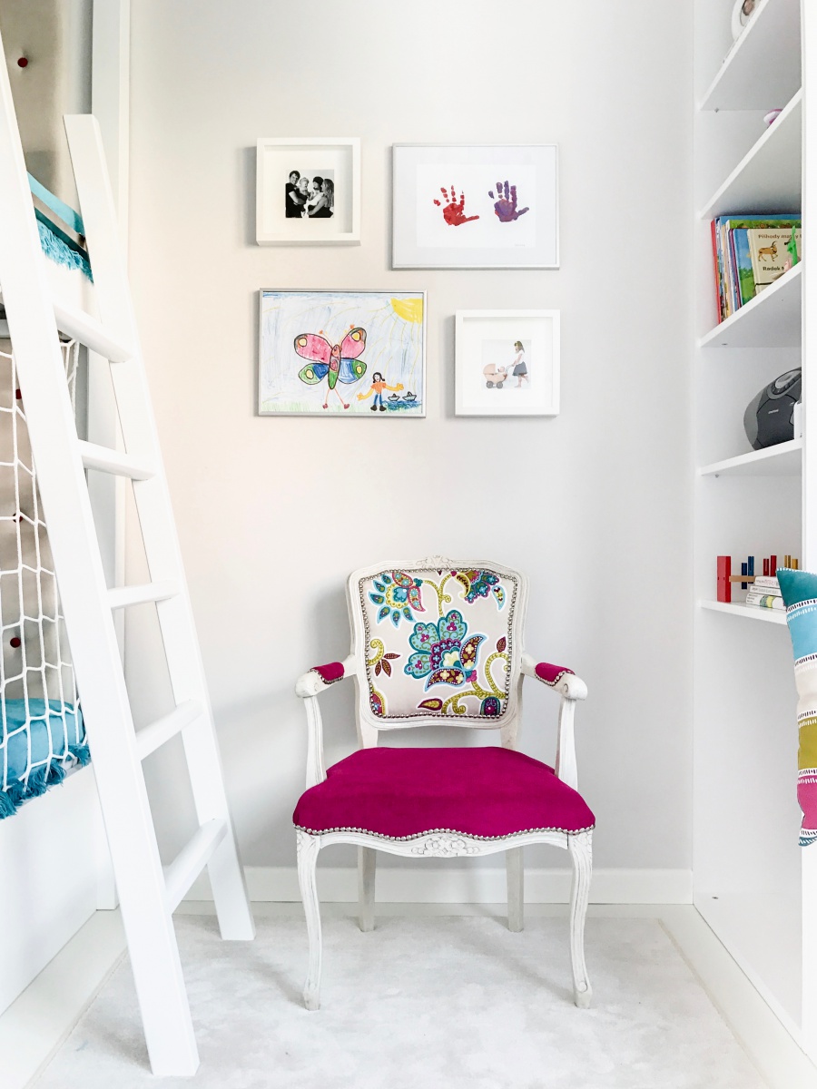 Vzhledem k velikosti pokoje bylo nutné použít patrovou postel, která je vyrobená dle mého návrhu na míru ze dřeva, stejně jako ostatní nábytek v pokoji. Pro větší bezpečnost je vysoké zábradlí na palandě kovové a dole jsem umístila síť s velkými oky, díky které z postele nevypadne ani mladší z dívek, která dole spí od svých 15 měsíců. Naproti palandě je veliká skříň, která pojme jak veškeré oblečení dívek tak velké množství hraček, které jsou umístěné hlavně ve spodních hlubokých zásuvkách. Nechybí ani knihovna, tajný úložný prostor pod lavicí, žebřiny na míru a křesílka.