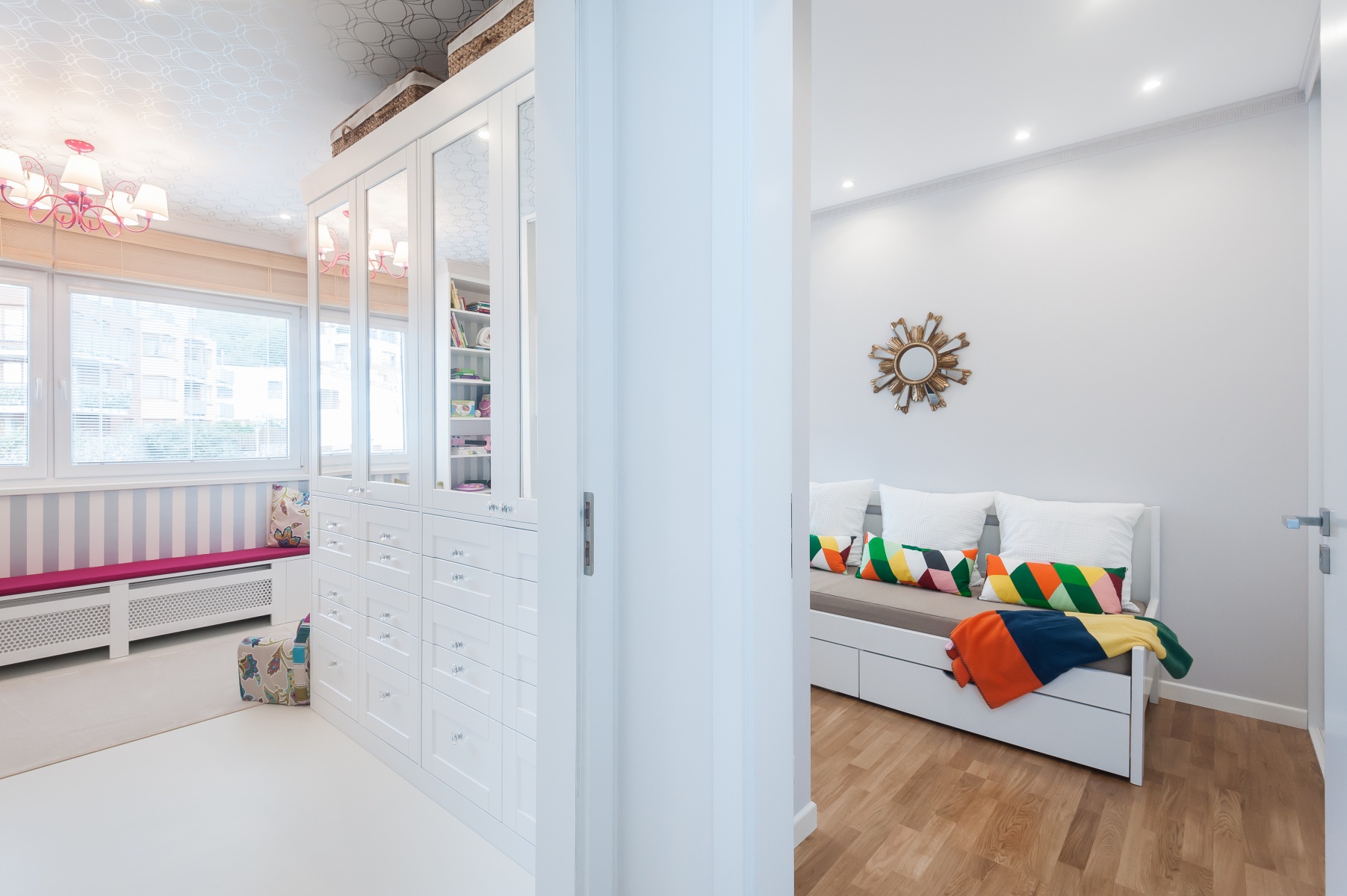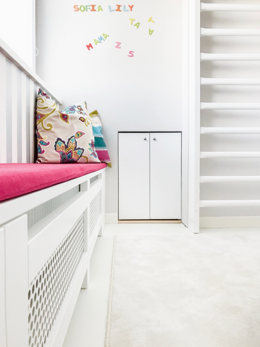 Základ pokoje tvoří pouze neutrální barvy, které se ani časem neokoukají. Barvy do pokoje vnáší pouze doplňky, které je jednoduché časem obměnit. Na podlahu jsem použila světlounké PVC, které je příjemné na hraní a skvěle se udržuje. Vzhledem k tomu, že současně probíhala rekonstrukce i vedlejšího pokoje, kde mají dívky pracovní stůl, nechala jsem mezi pokoji malý průlez s dvířky.
