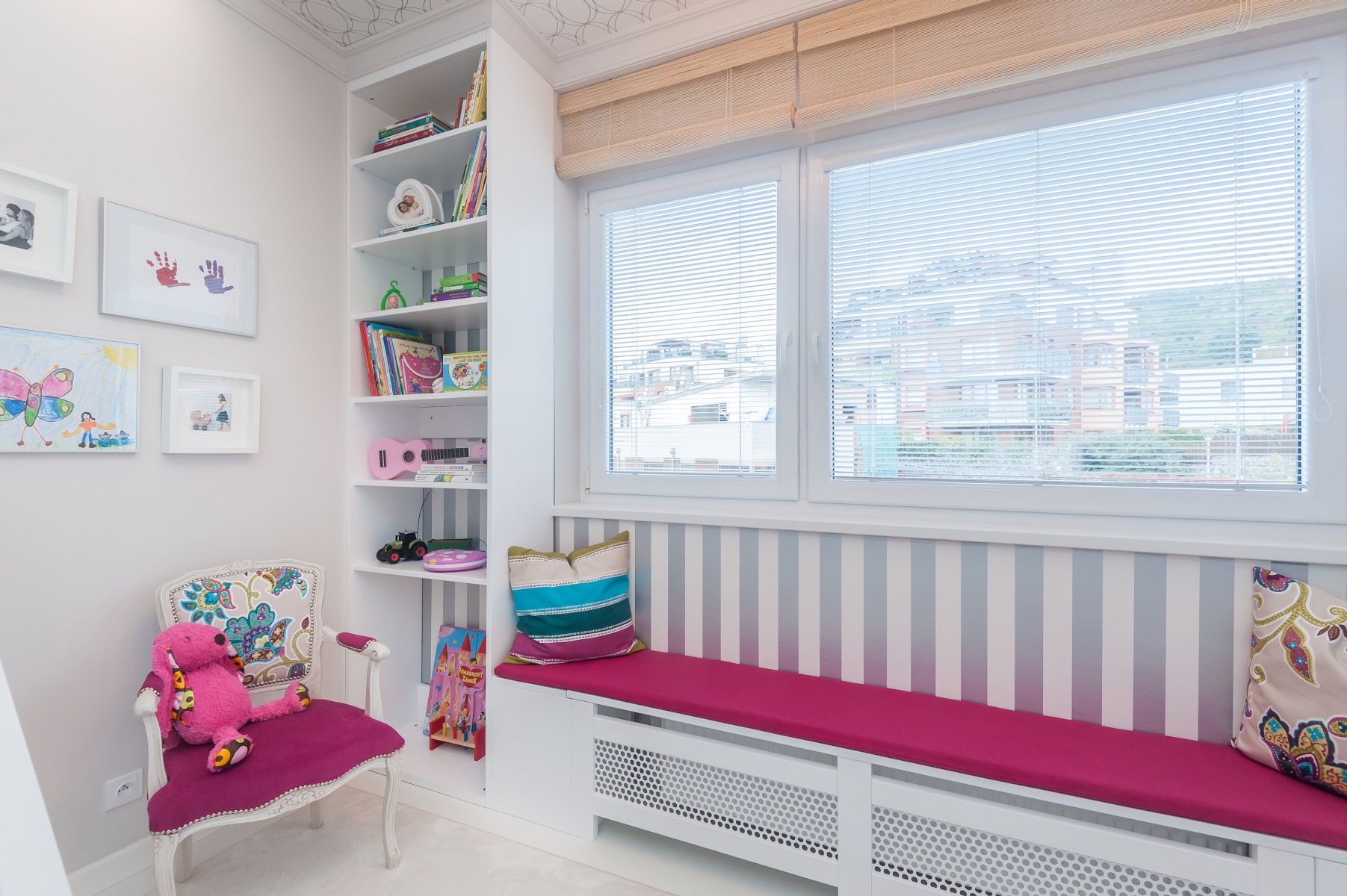 Pohled na kryt na radiátor alias lavici, knihovnu a křesílko.