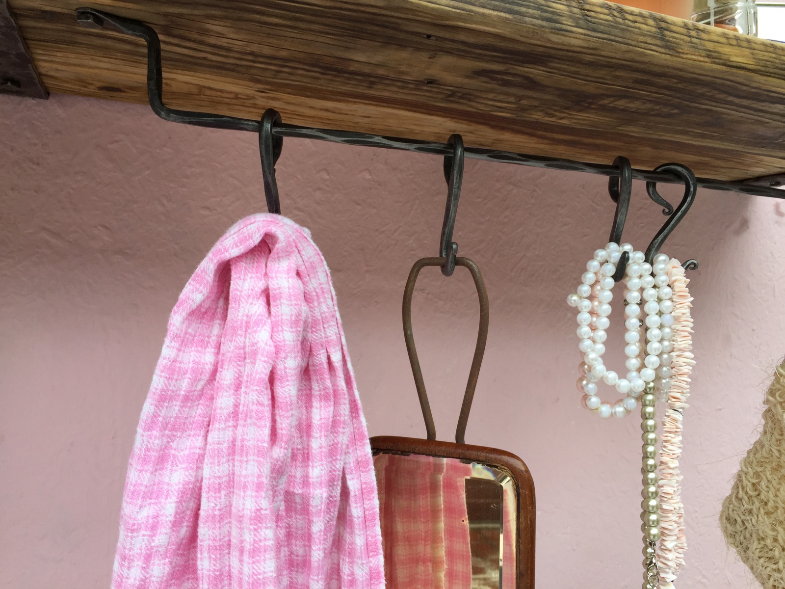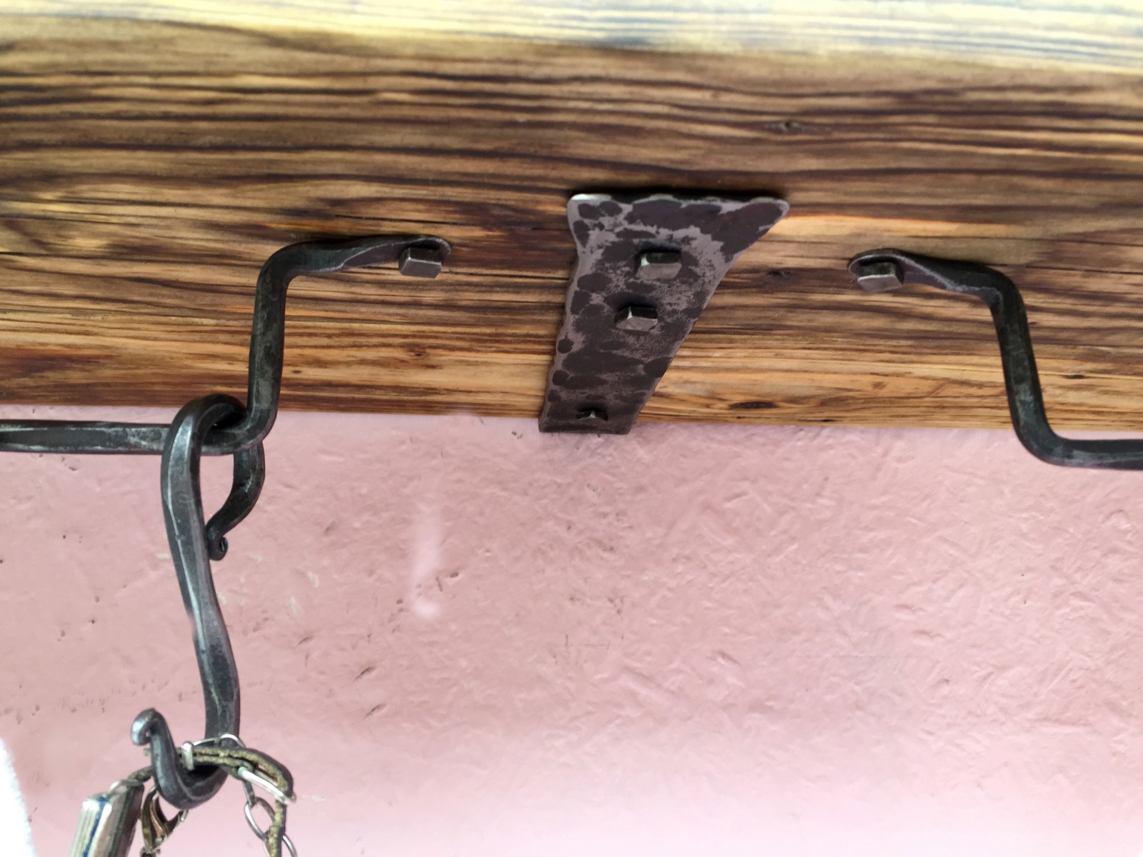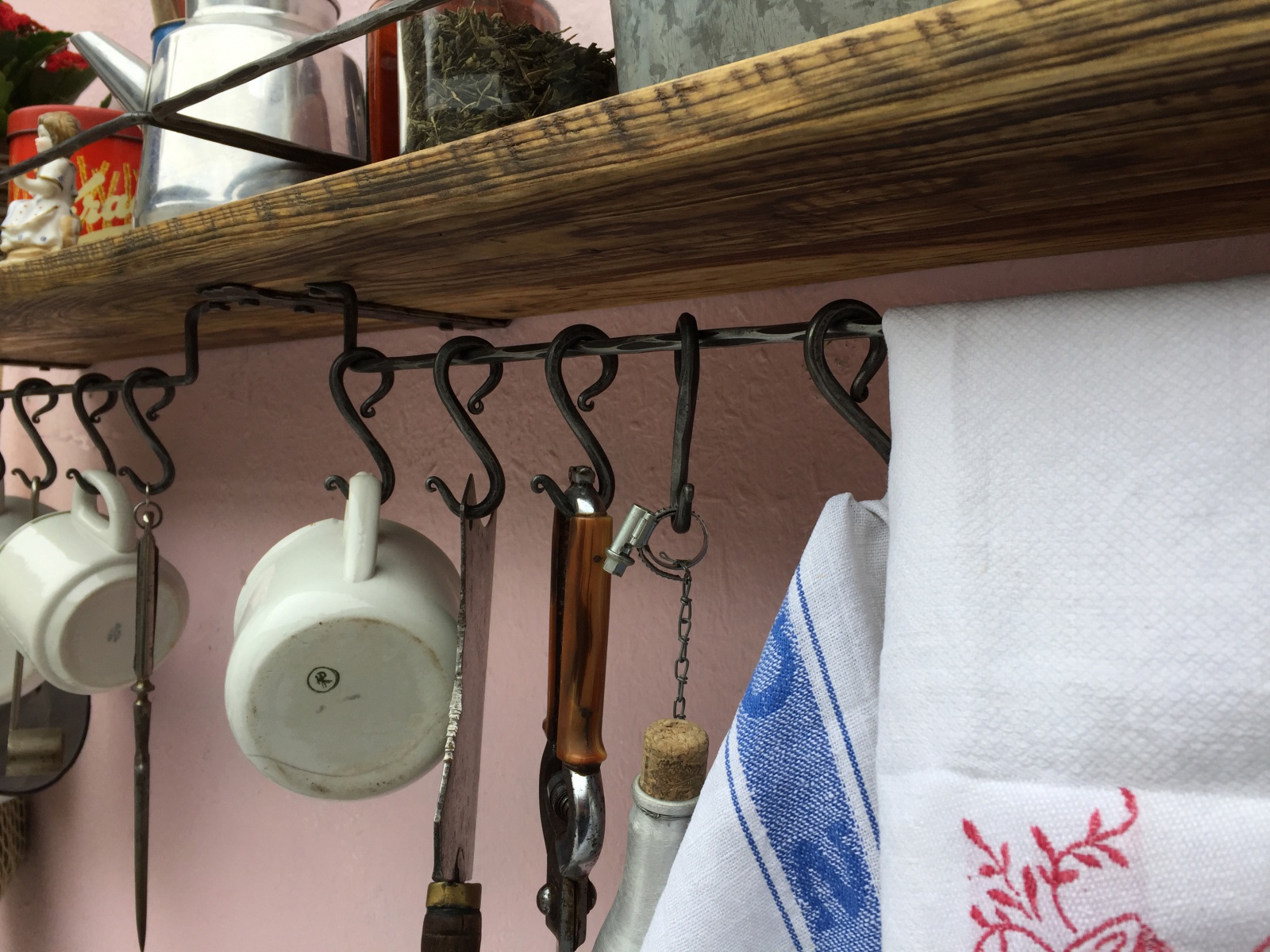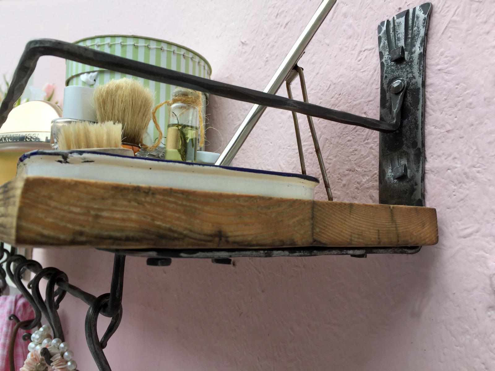 Dlouhá police se spodní rampou s kovanými háčky.