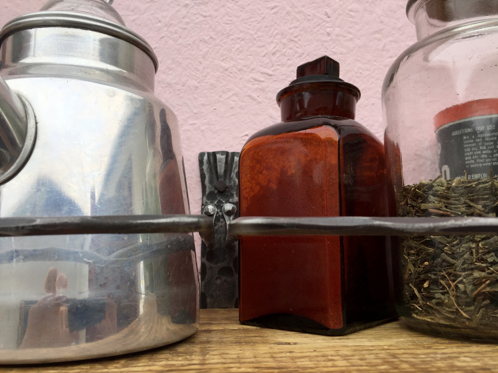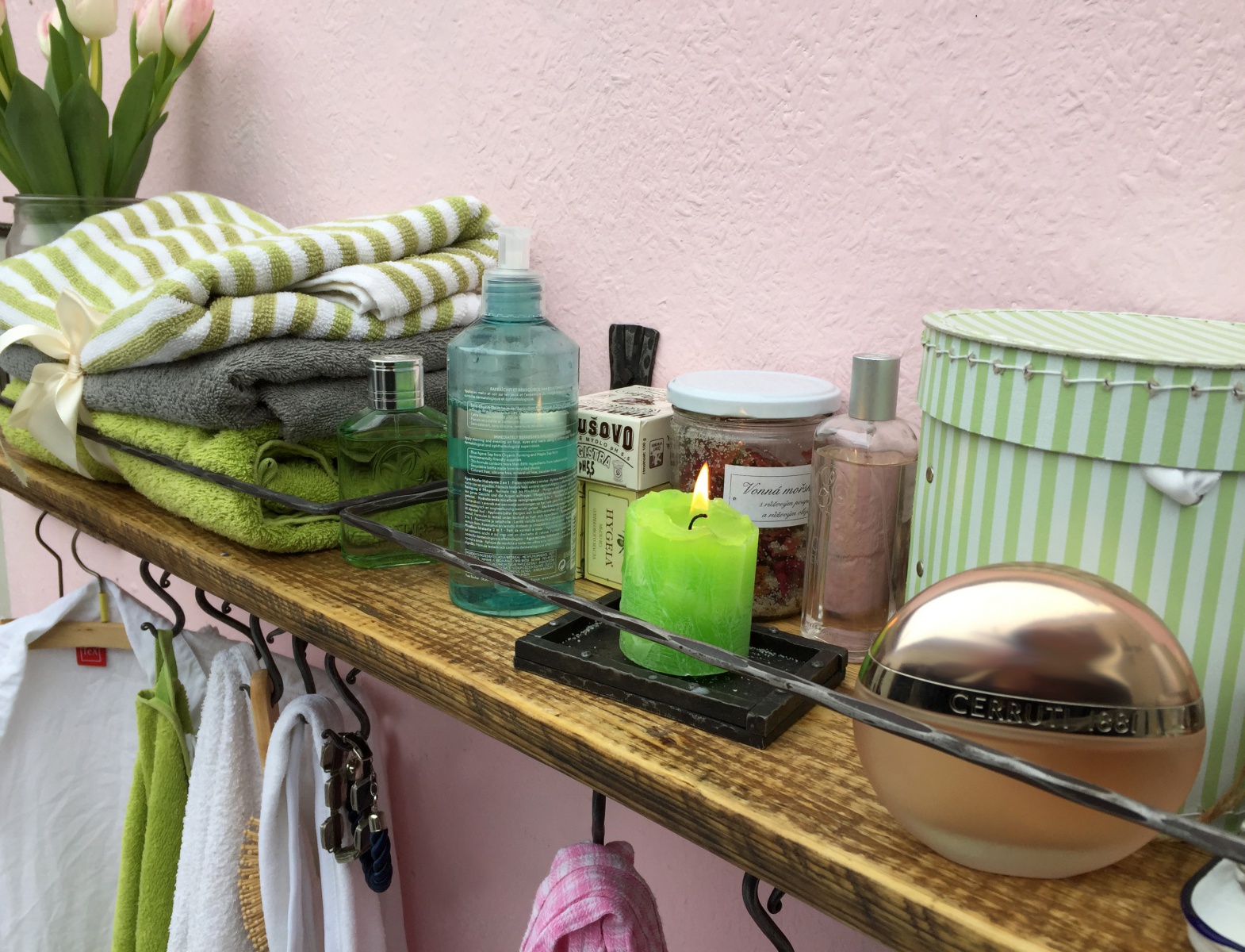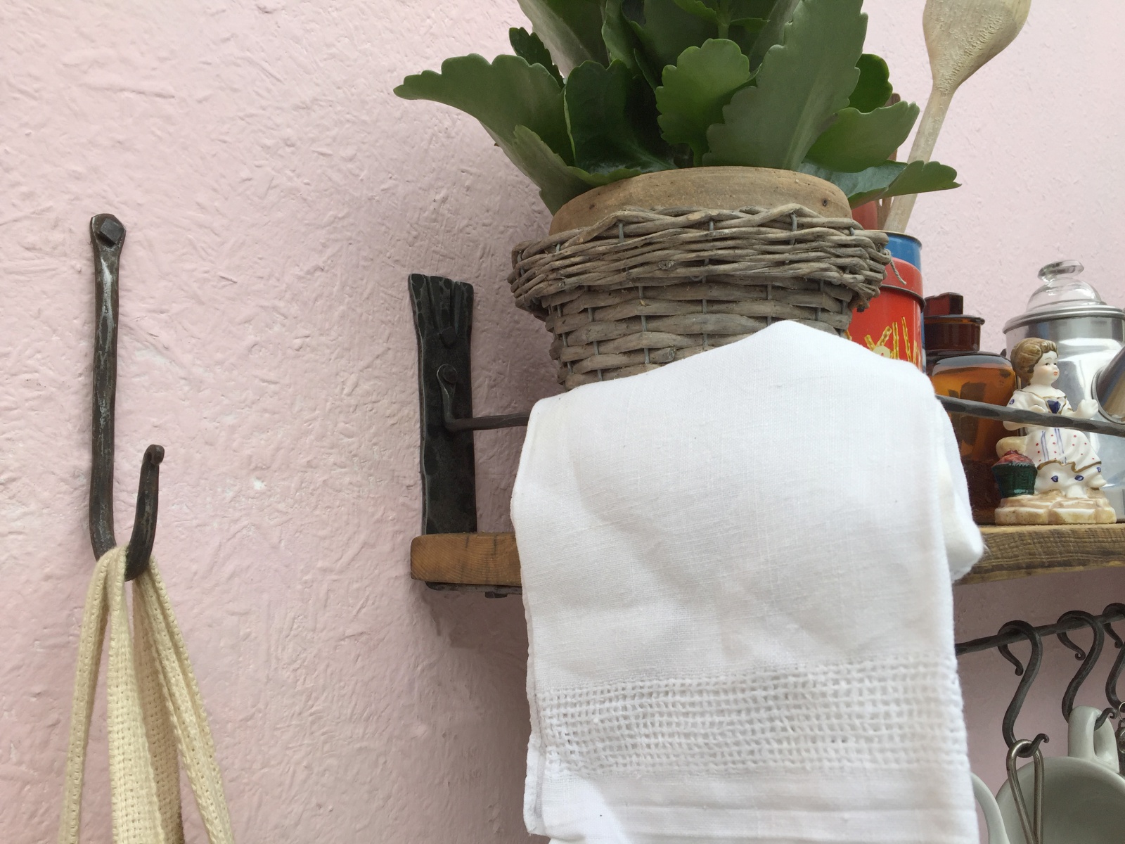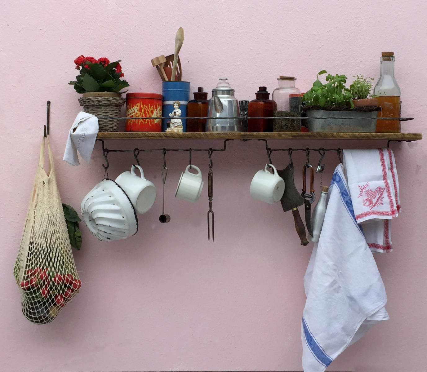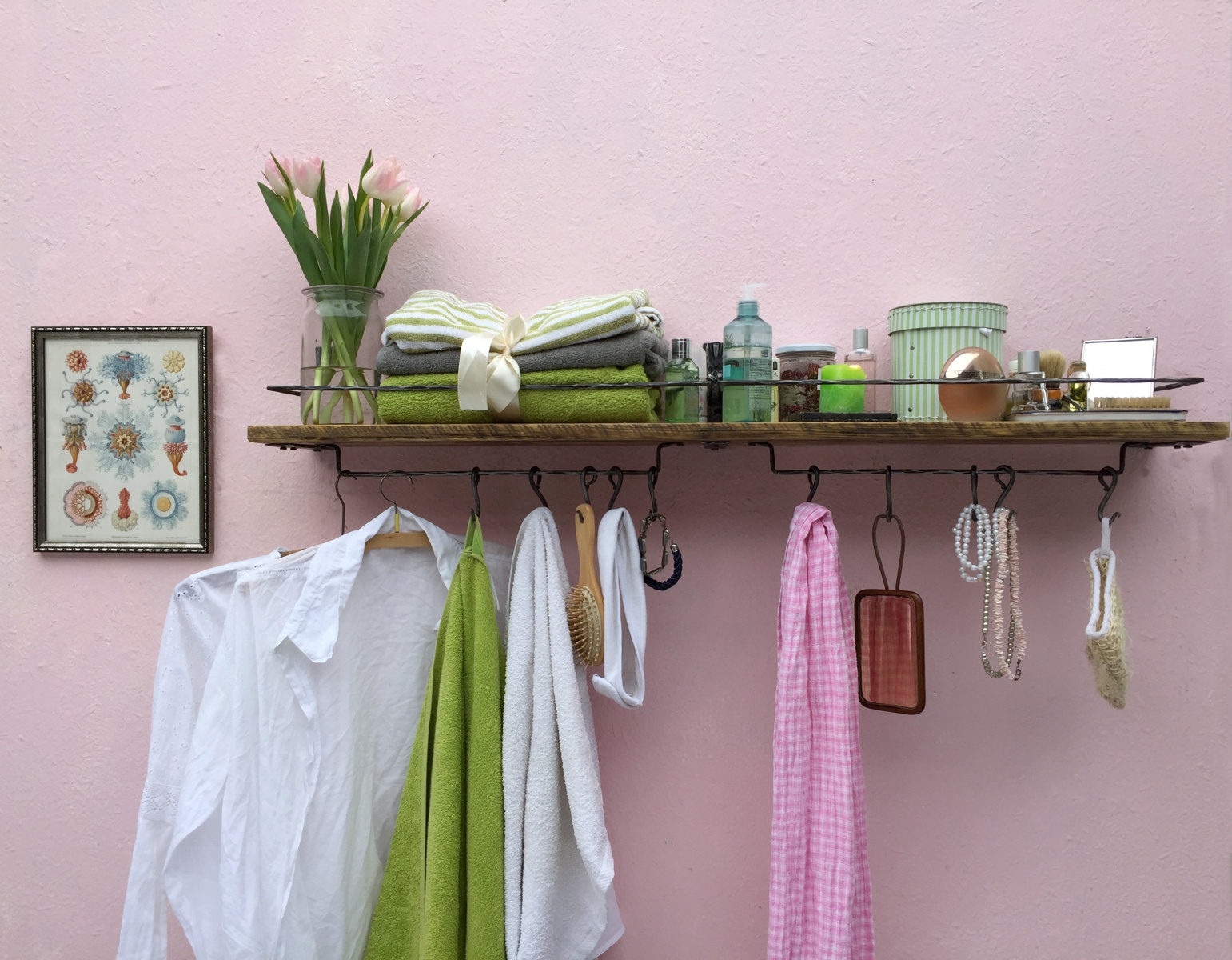 Dlouhá police se spodní rampou s kovanými háčky.