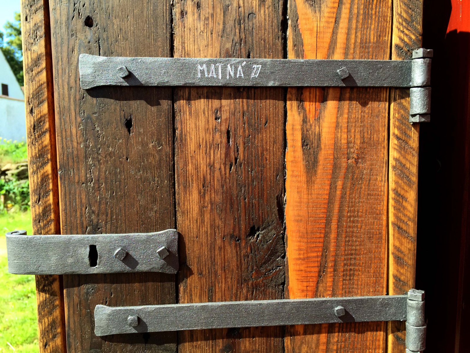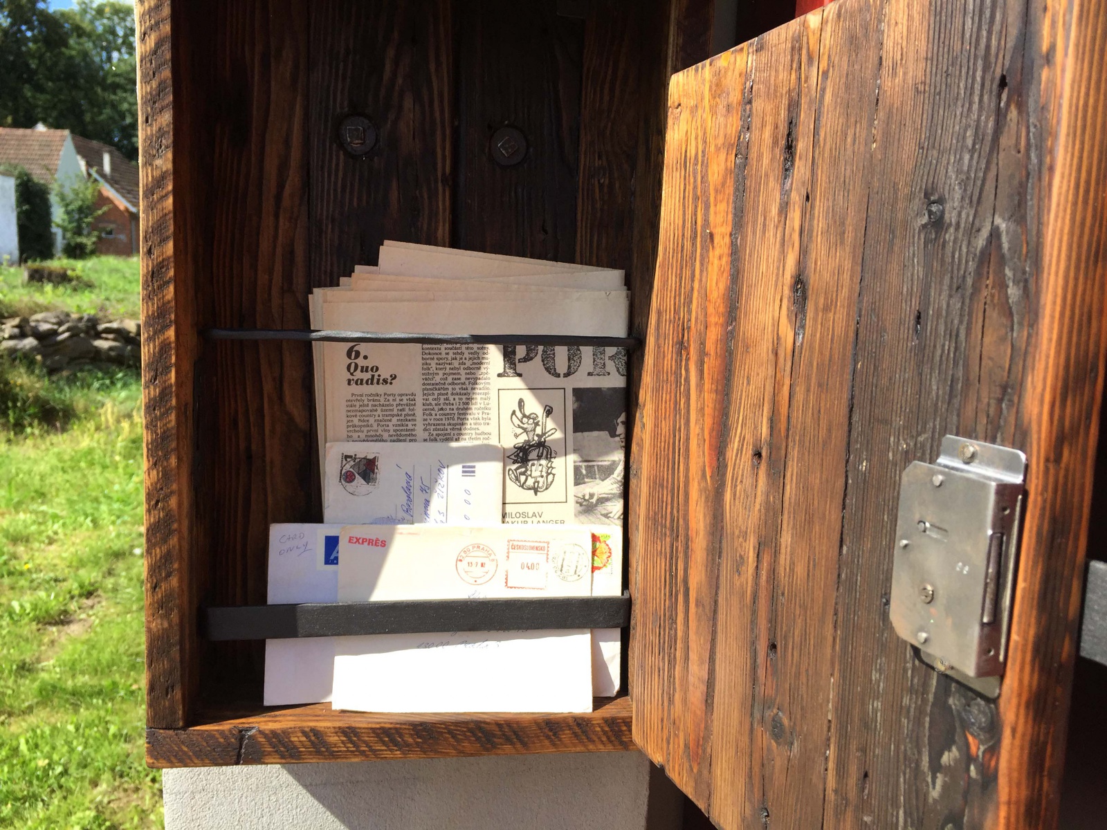 Poštovní schránka ze starého dřeva a ručně kované oceli.