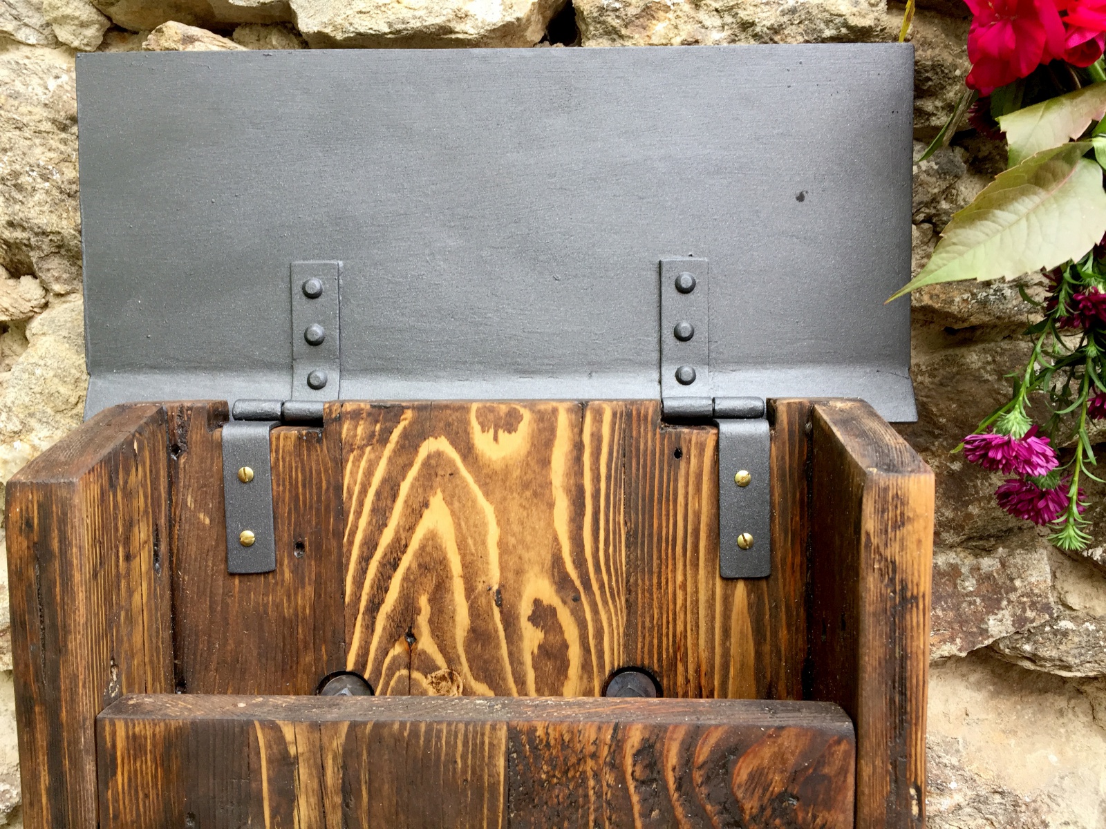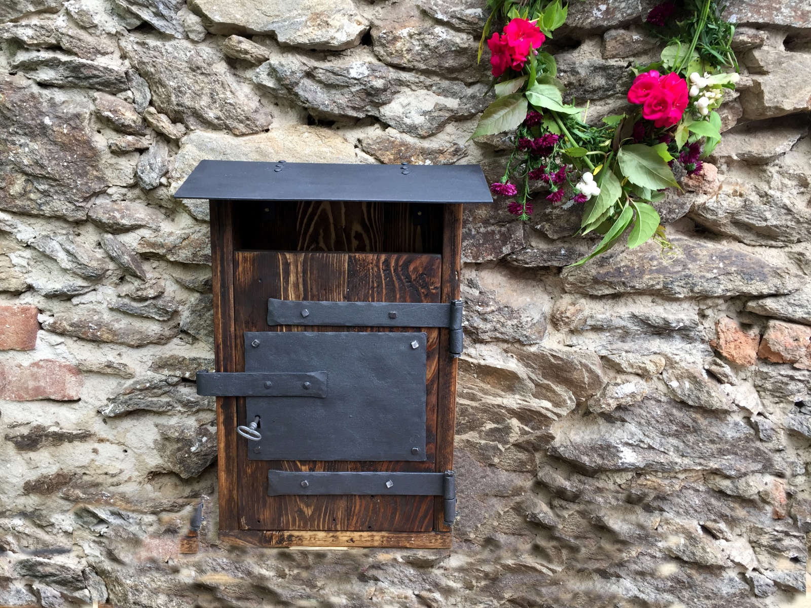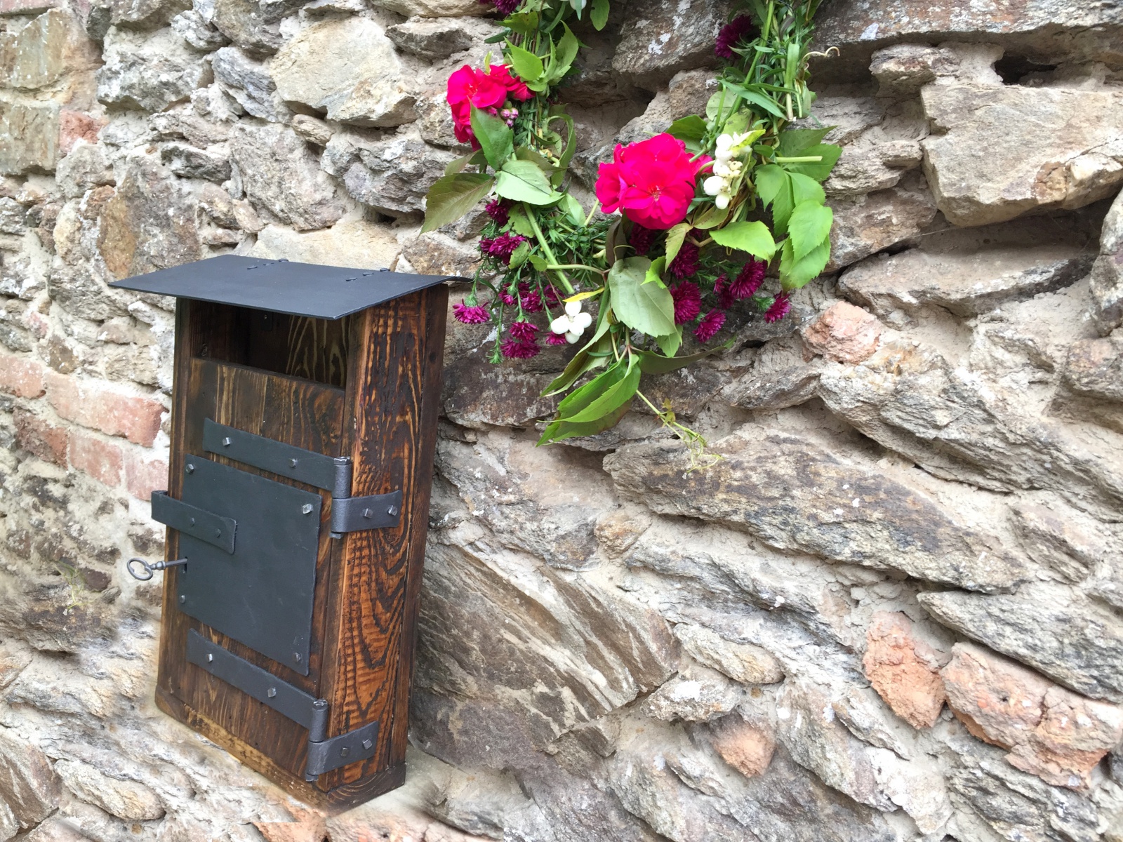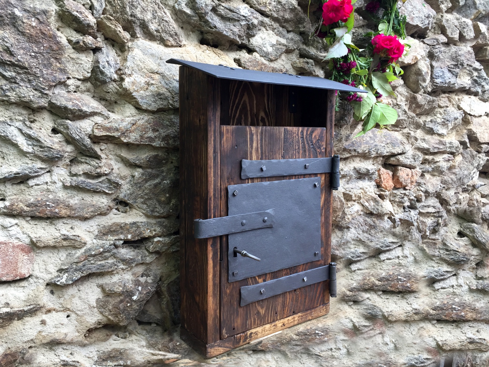 Poštovní schránka ze starého dřeva s kovaným čelem.