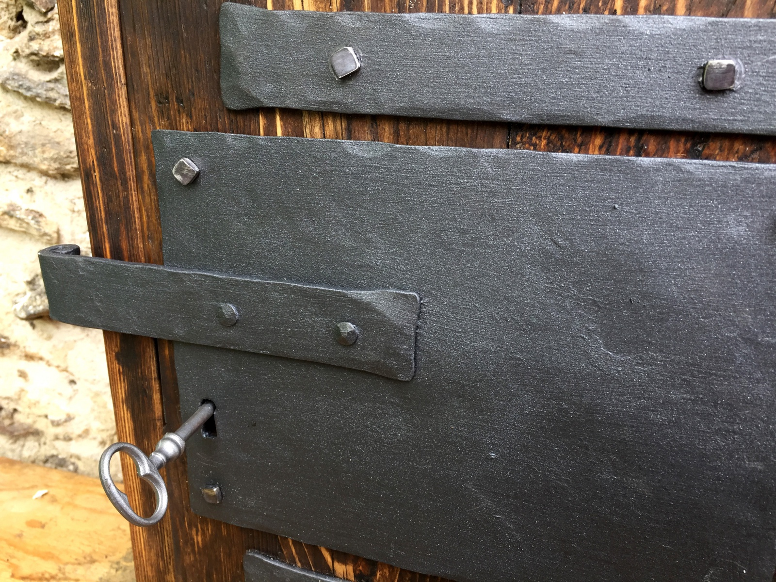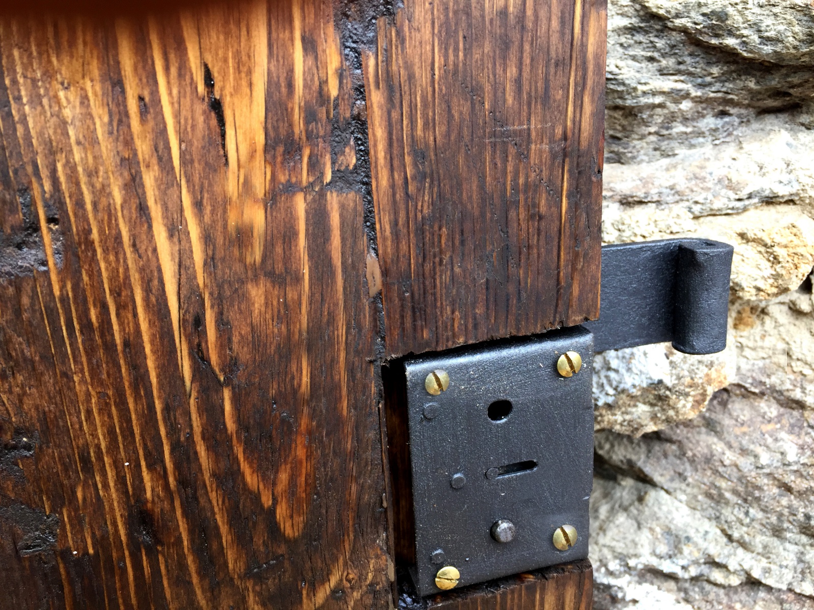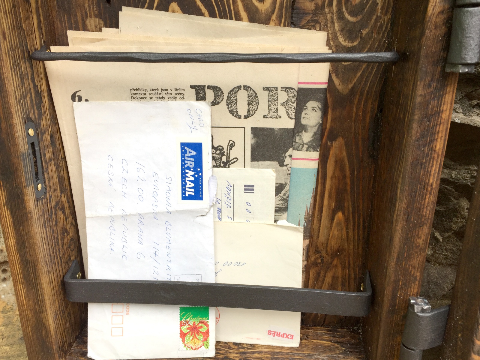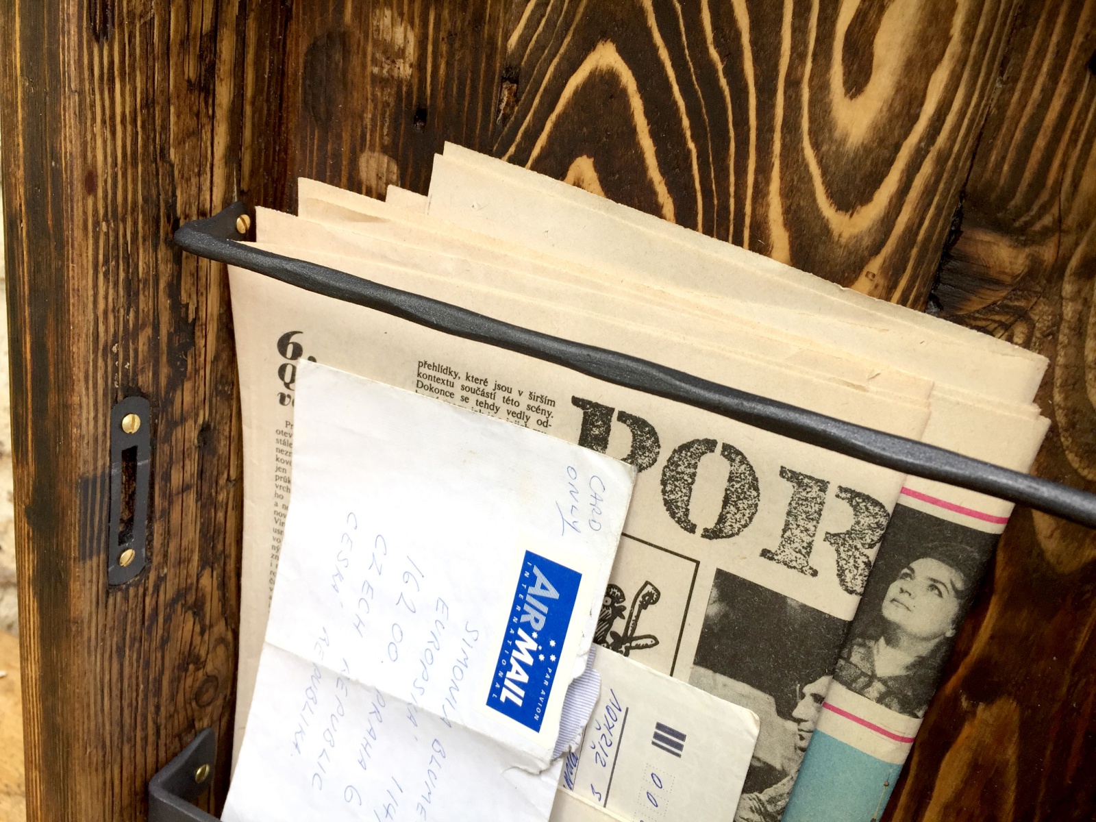 Poštovní schránka ze starého dřeva s kovaným čelem.