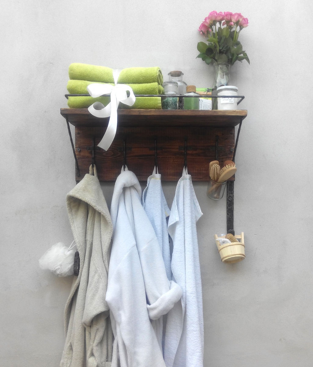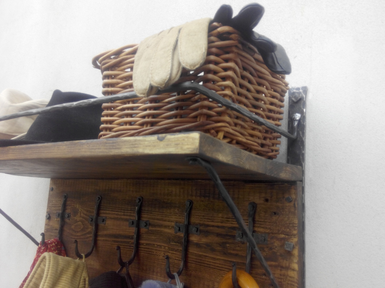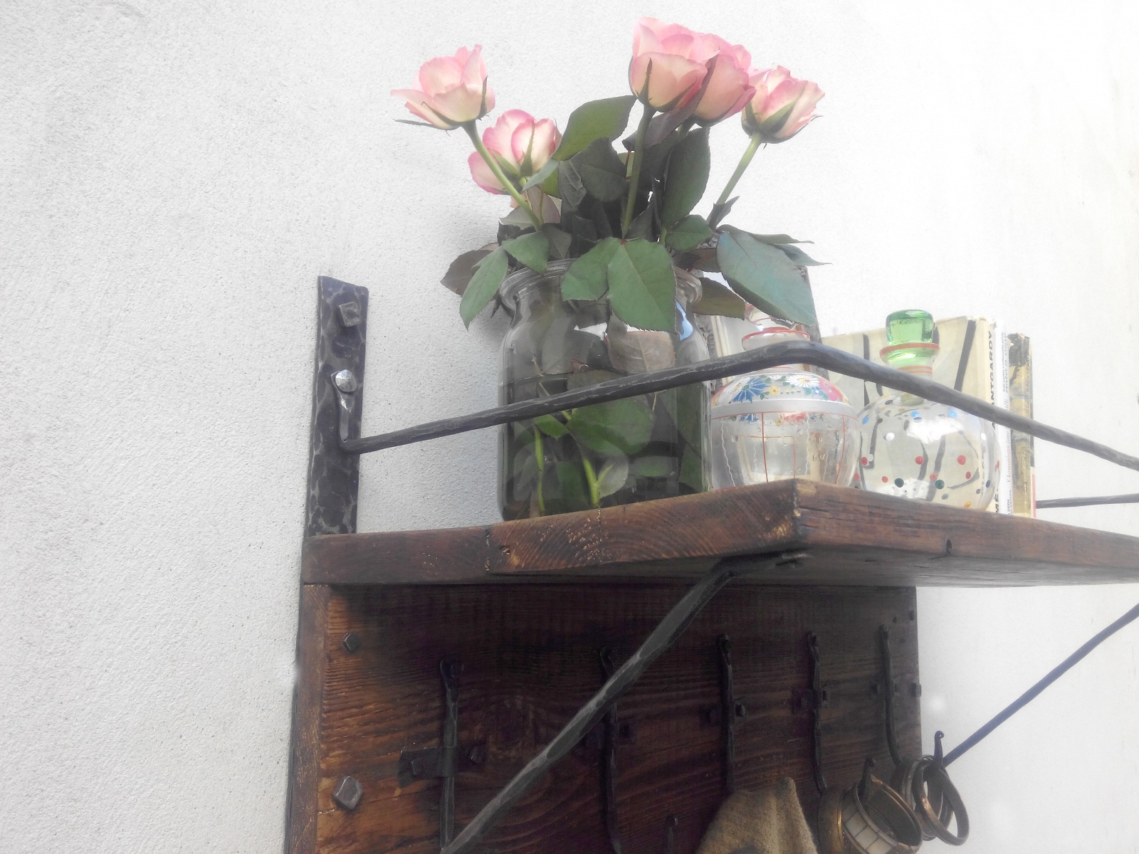 Věšák ze starého dřeva a ručně kované a broušené oceli s pevnostními háčky.