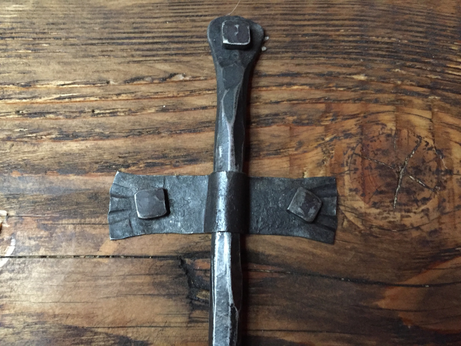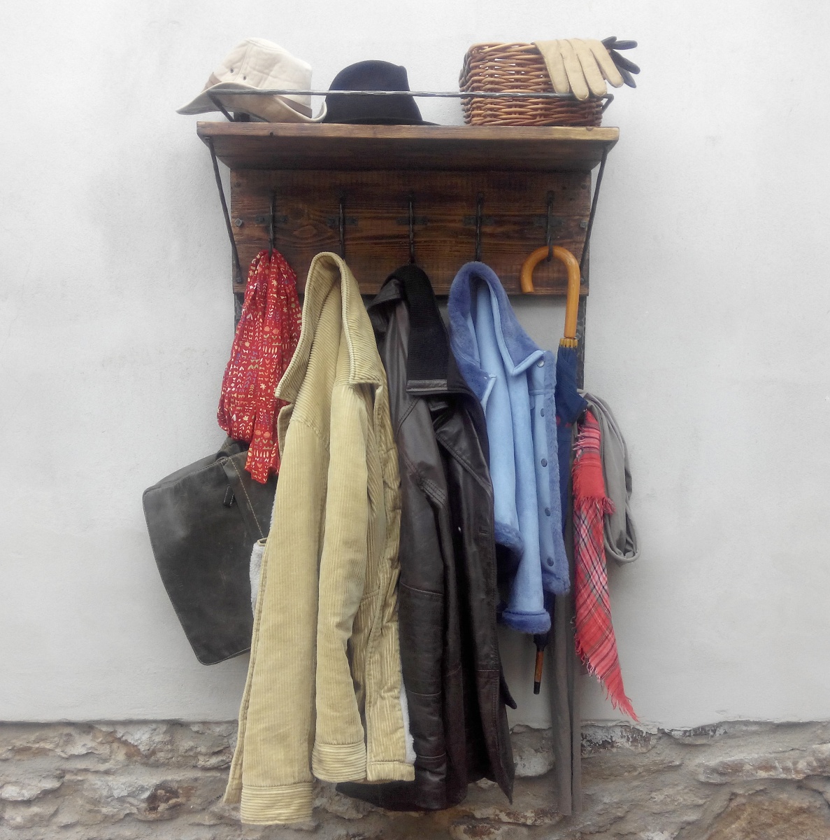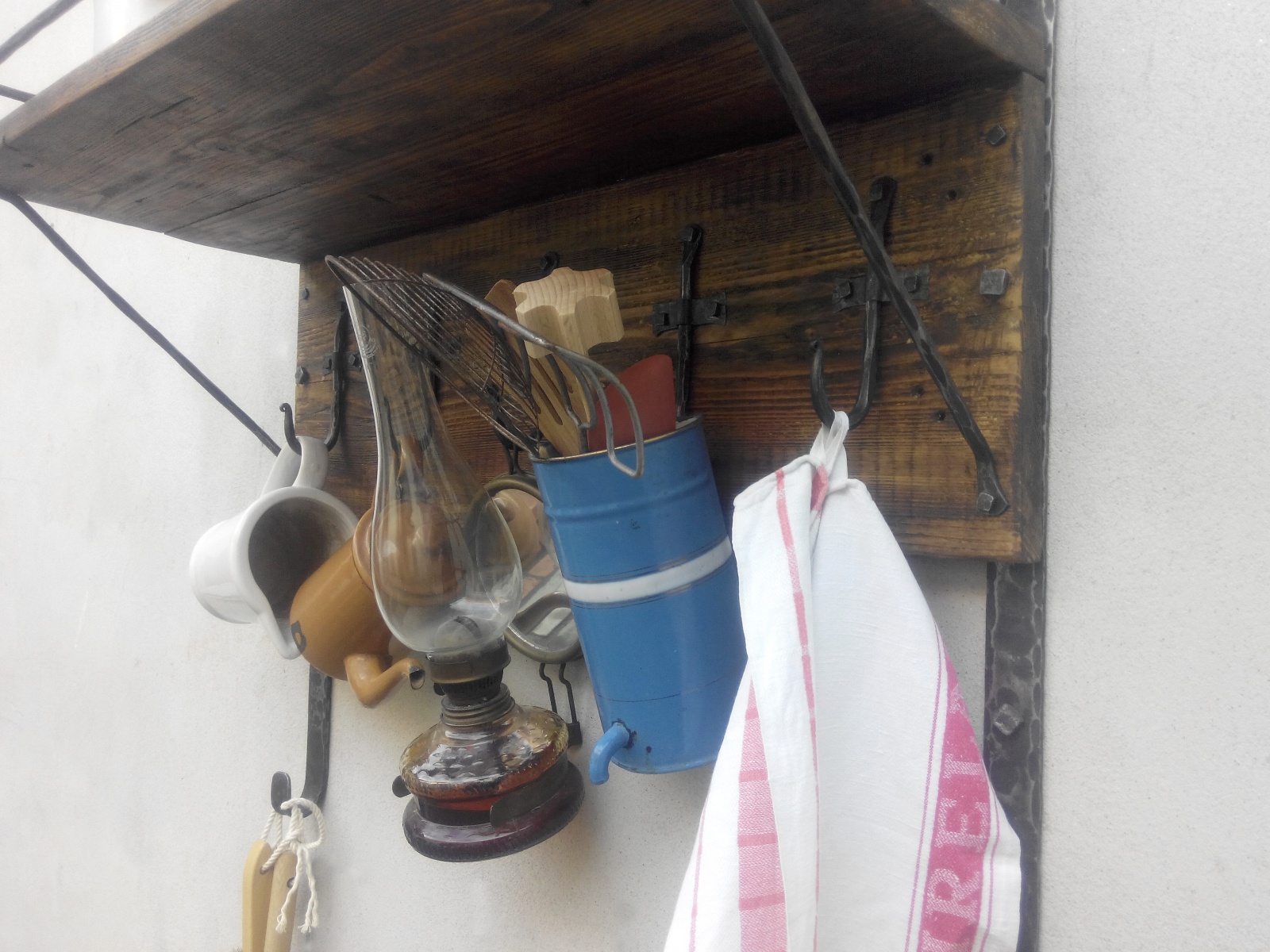 Věšák ze starého dřeva a ručně kované a broušené oceli s pevnostními háčky.