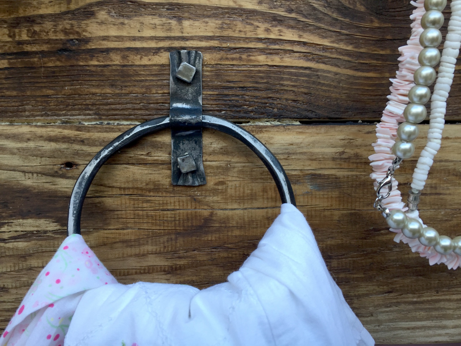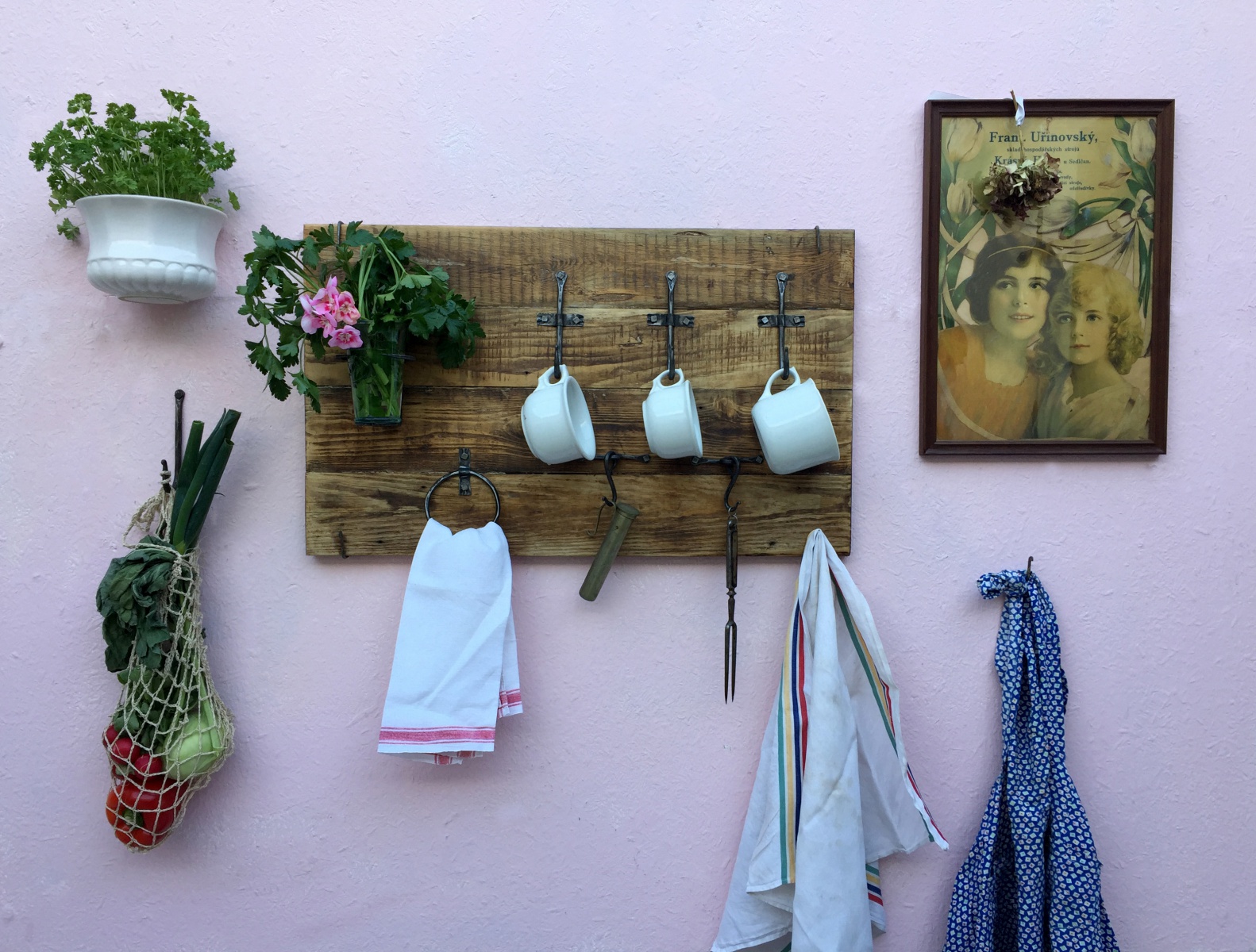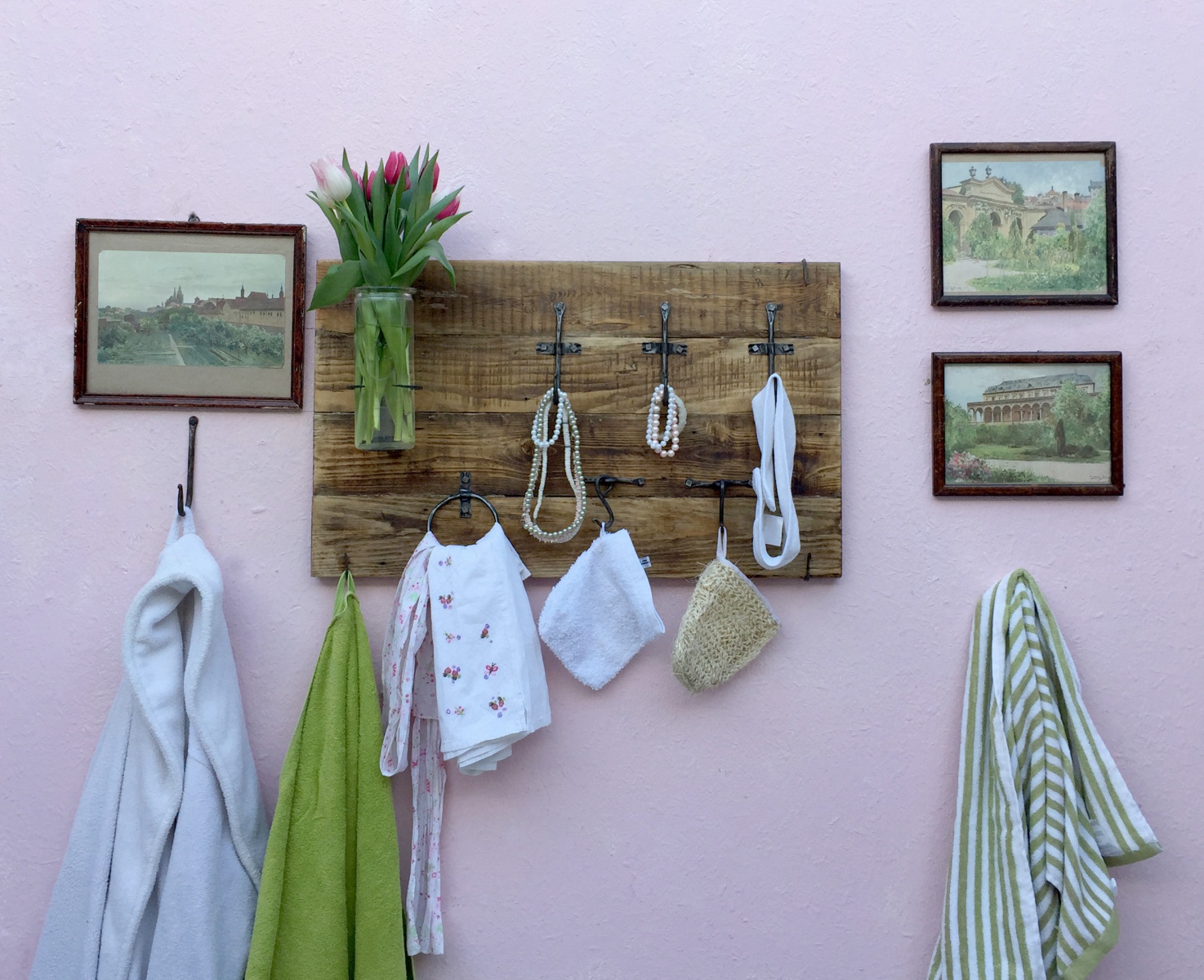Věšák s držákem a vázu a kruhem na šátky.