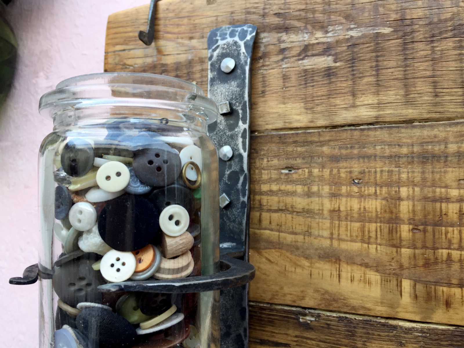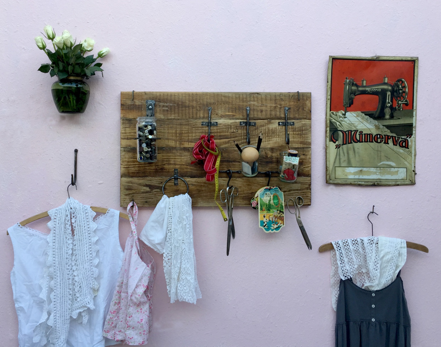 Věšák ze starého dřeva s držákem na vázu.
