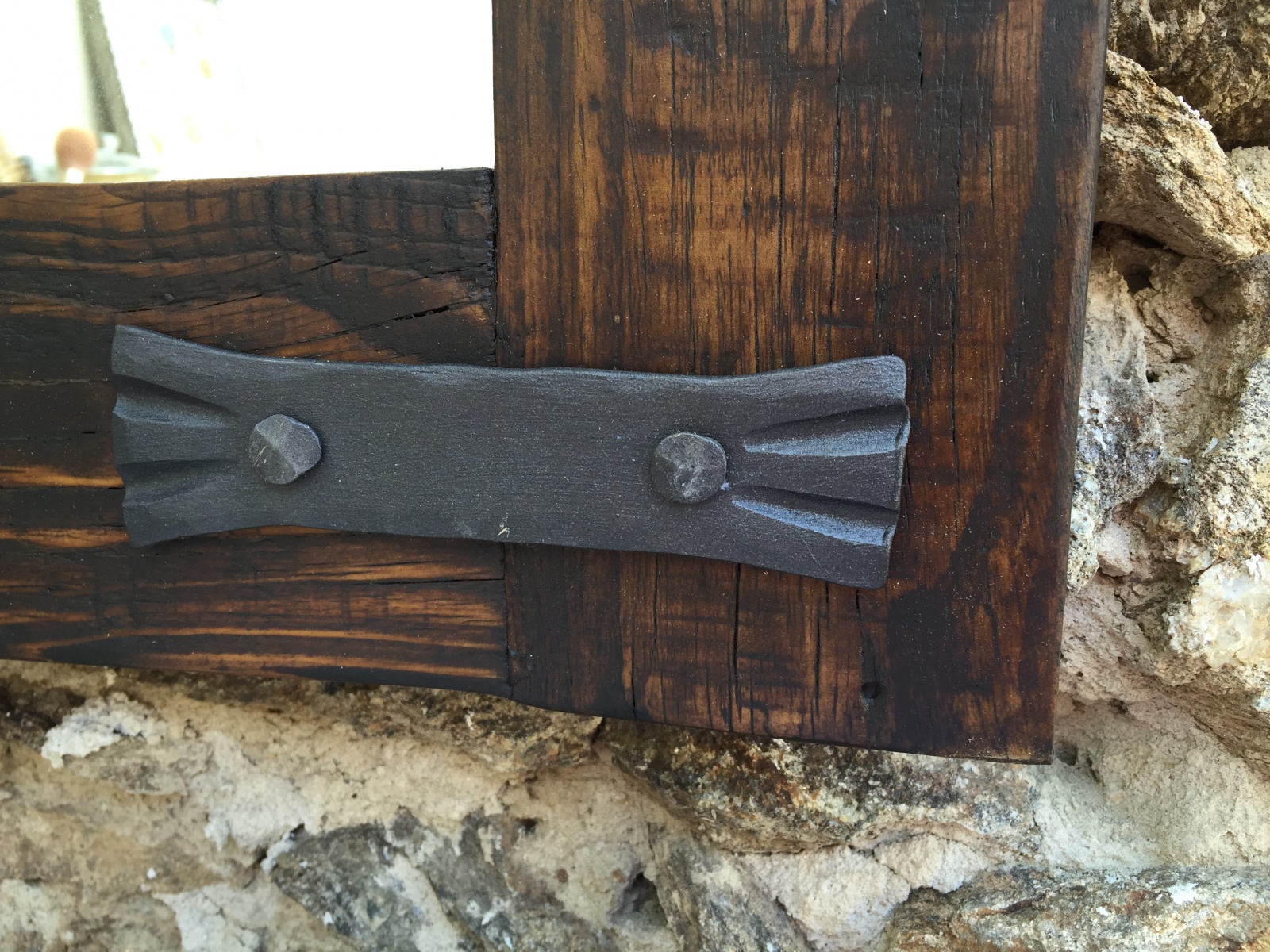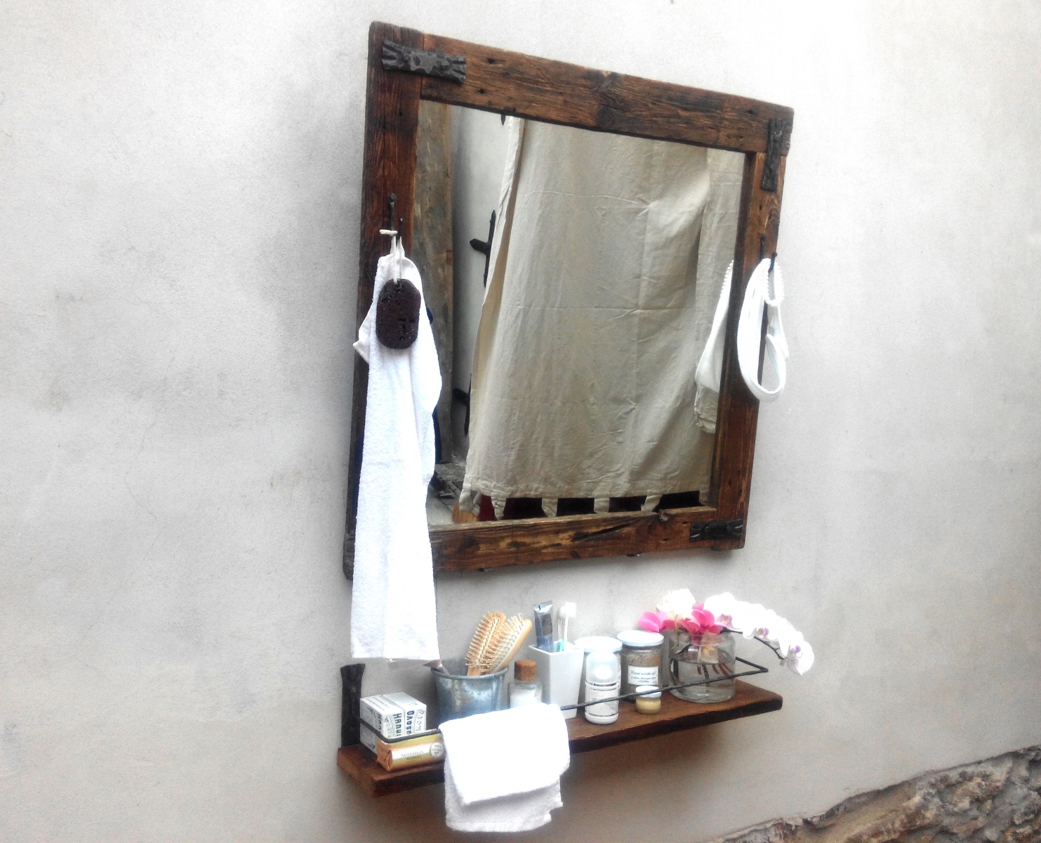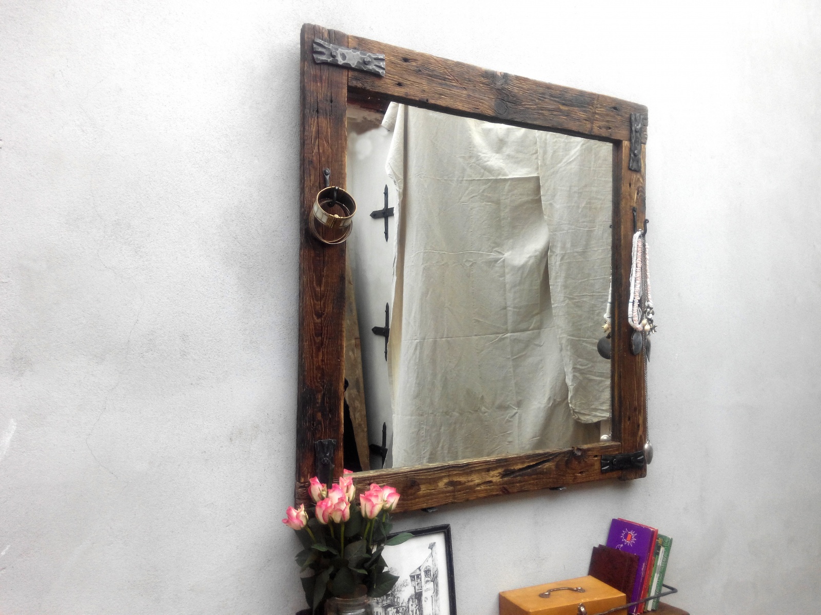 Zrcadlo Workshop #1 - vyrábíme rozměry podle přání zákazníka. Rám vyroben ze starého dřeva. Má své šrámy, historii a krásu.Šrouby, hřebíky i ozdoby jsou ručně kované bez použití polotovarů. Zavěšení možné přímo na zeď nebo naklopením pomocí kovaného háku. Jako druhé jištění slouží dvě kované podpěry, které se montují pod spodní zrcadlovou lištu.