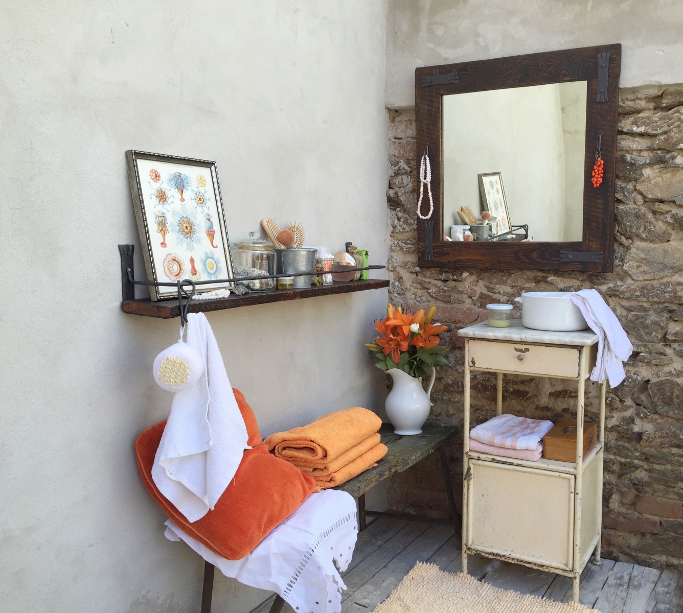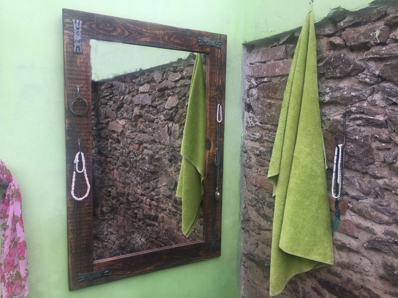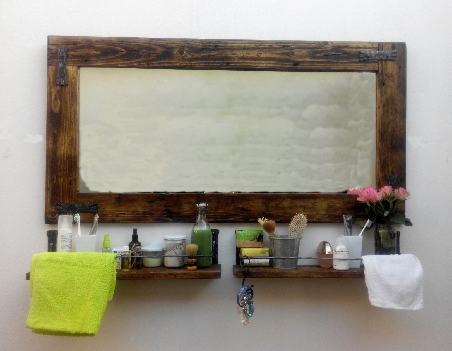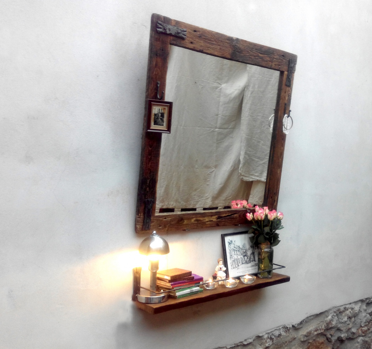 Zrcadlo Workshop #1 - vyrábíme rozměry podle přání zákazníka. Rám vyroben ze starého dřeva. Má své šrámy, historii a krásu.Šrouby, hřebíky i ozdoby jsou ručně kované bez použití polotovarů. Zavěšení možné přímo na zeď nebo naklopením pomocí kovaného háku. Jako druhé jištění slouží dvě kované podpěry, které se montují pod spodní zrcadlovou lištu.