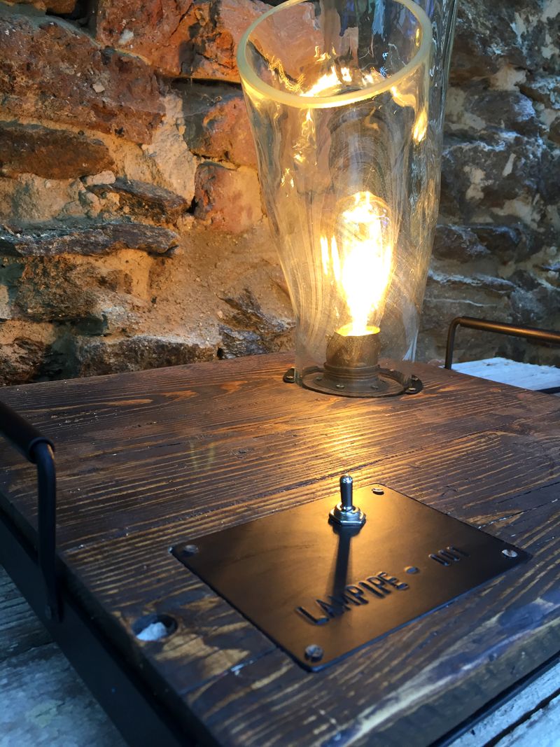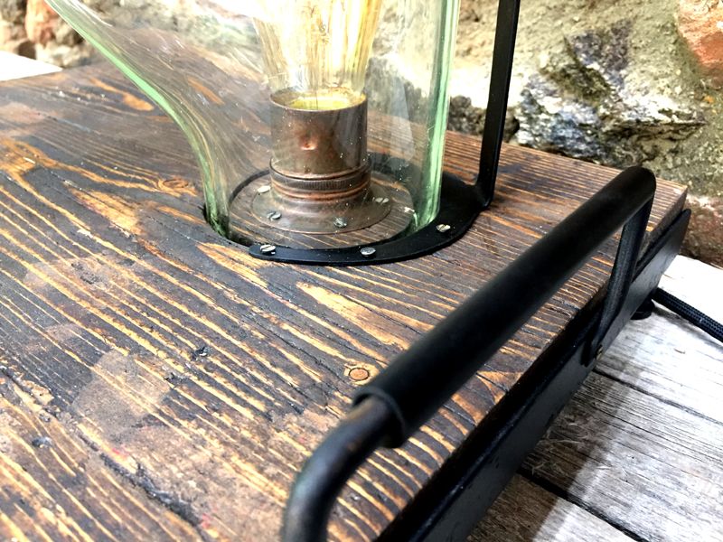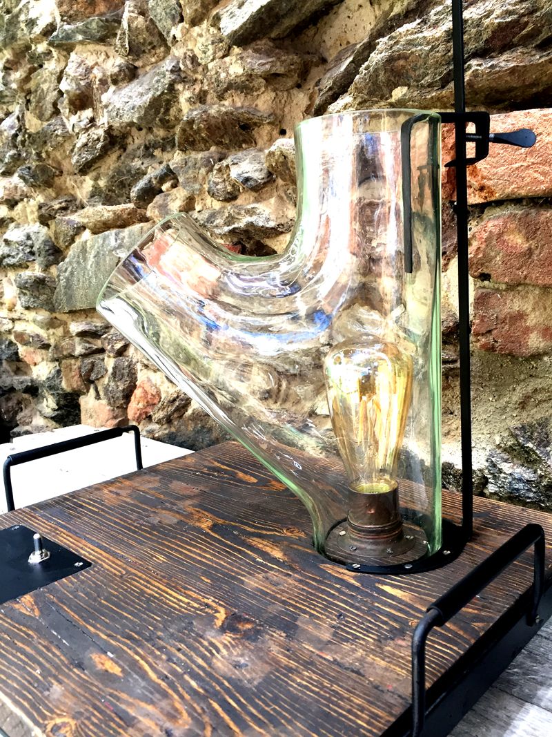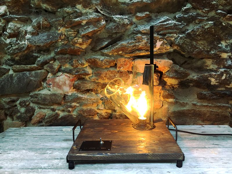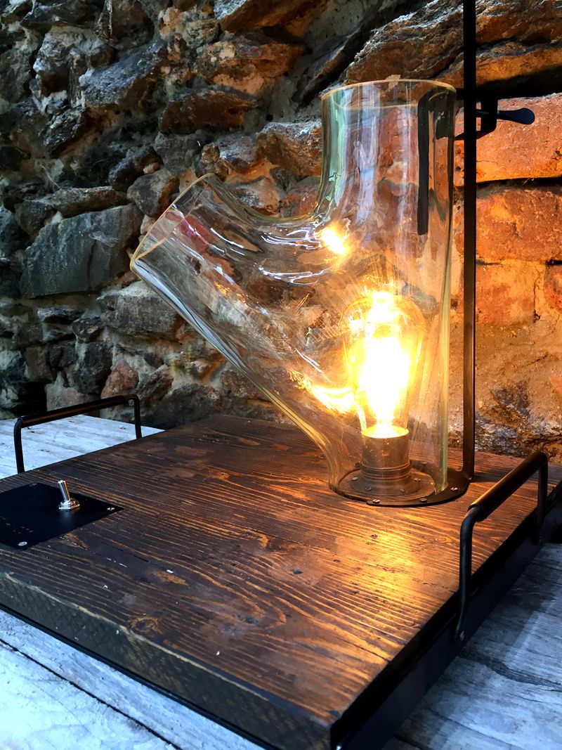 Lampa Lampipe, podstavec ze starého dřeva 41x37cm, celková výška, 45cm, výška skla 30cm. Sklo je původem velmi staré skleněné potrubí z technického provozu. Různé tvary i délky, vyrábíme v sériích omezených počtem těchto skleněných částí. Každá lampa je signovaná. Elektrické vedení je zafrézované ve spodní části podstavce a skryto ocelovým plechem, ocelové nožičky jsou stavitelné a zabraňují tak případné nerovnosti podkladu. LED vintage edisonka, retro přepínač, pohodlná madla na přenášení. Posuvný jezdec s vintage upínáním.