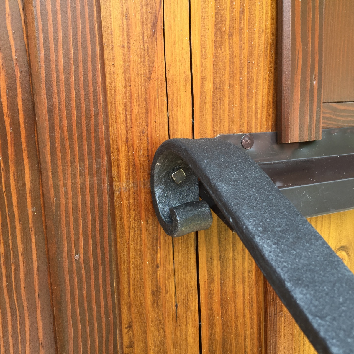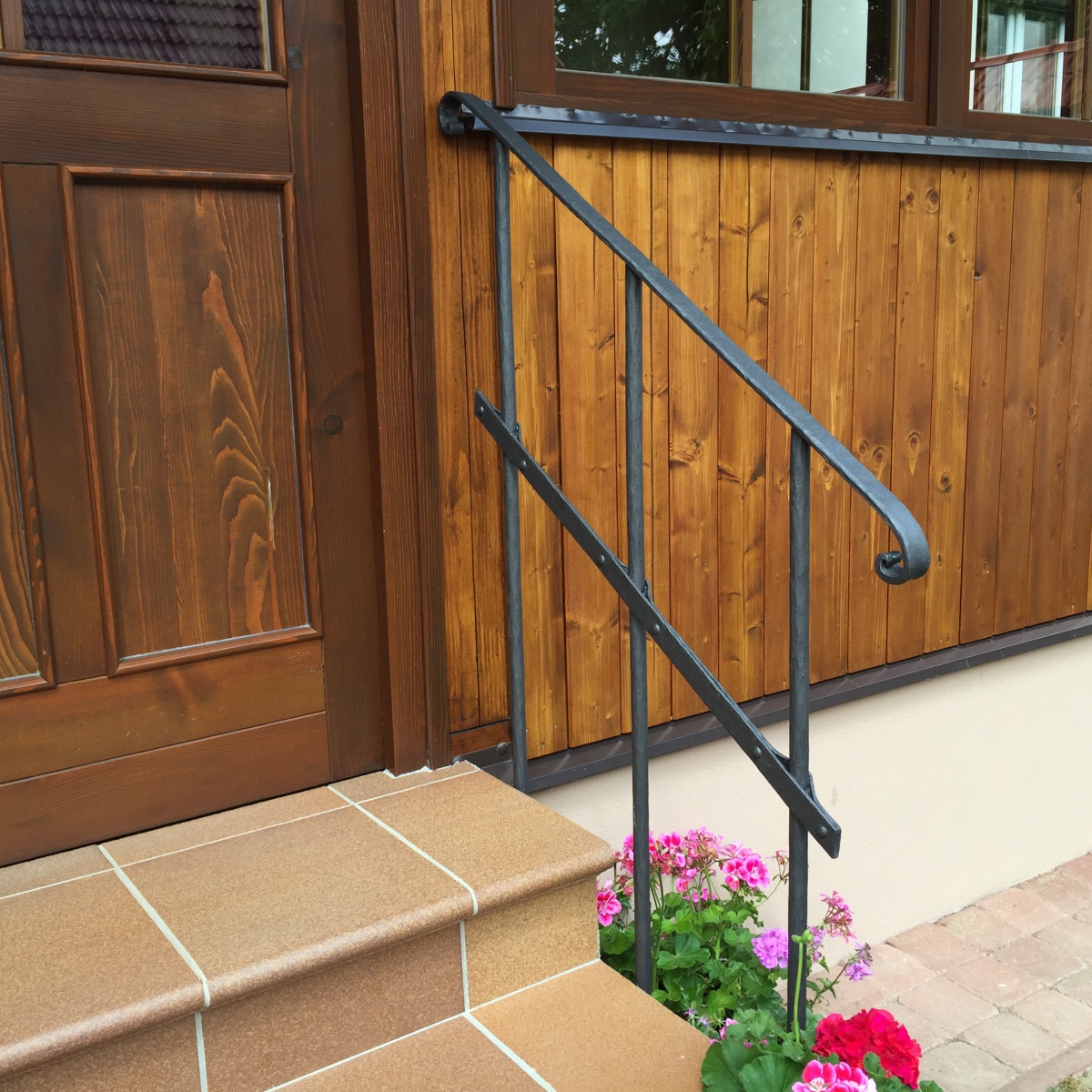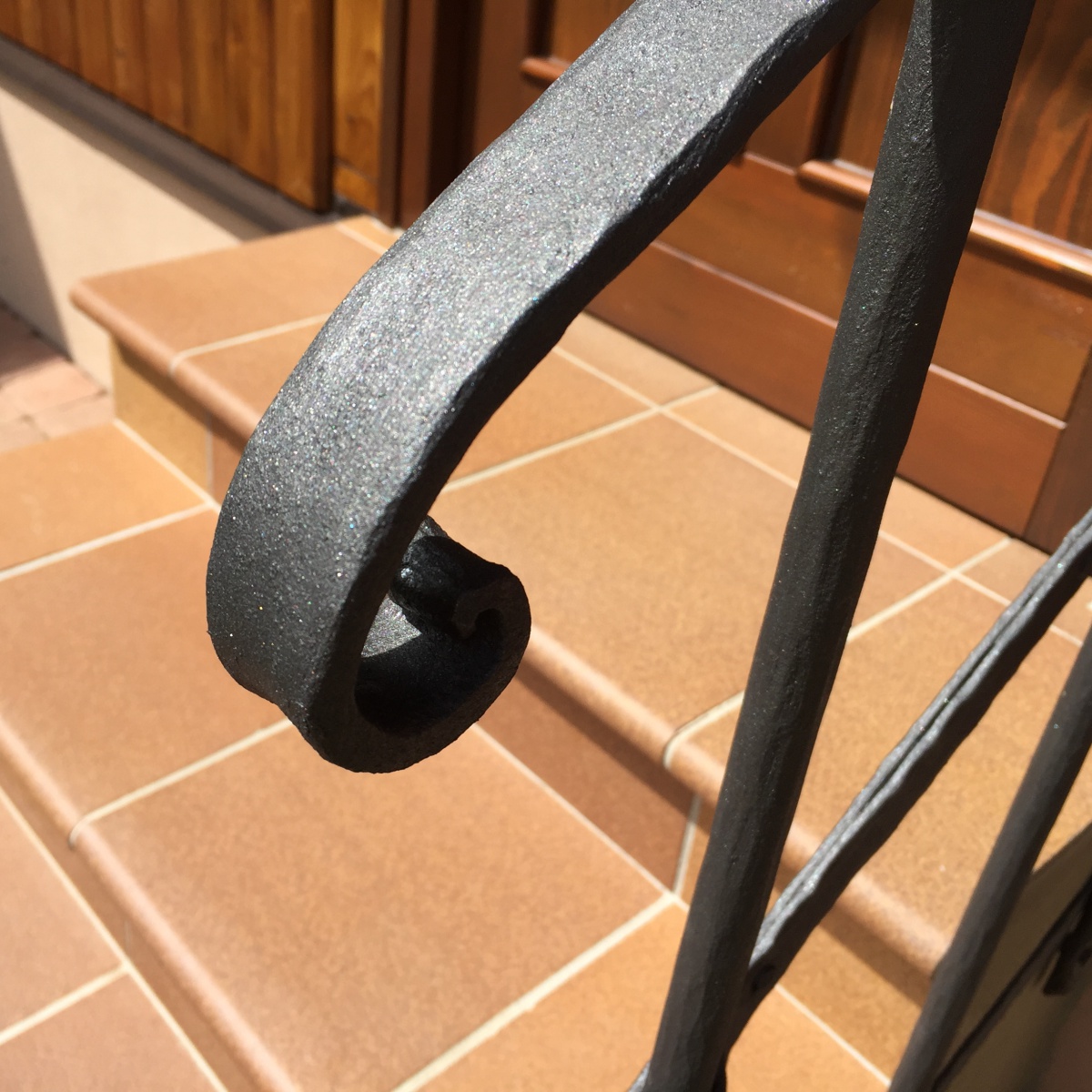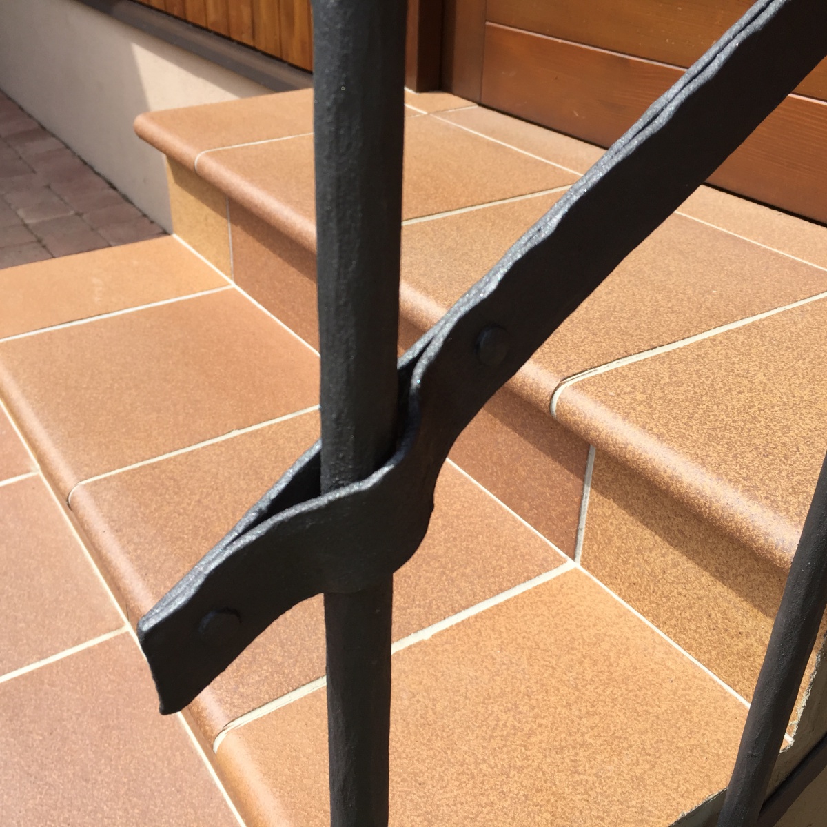 Zábradlí - práce na zakázku. Kombinace kulatých a plochých tyčí, schodišťový sklon, nýtování. Vše ruční výroba. Před nátěrem ošetřeno zinkováním, šrouby jsou nerezové s překovanou hlavou.