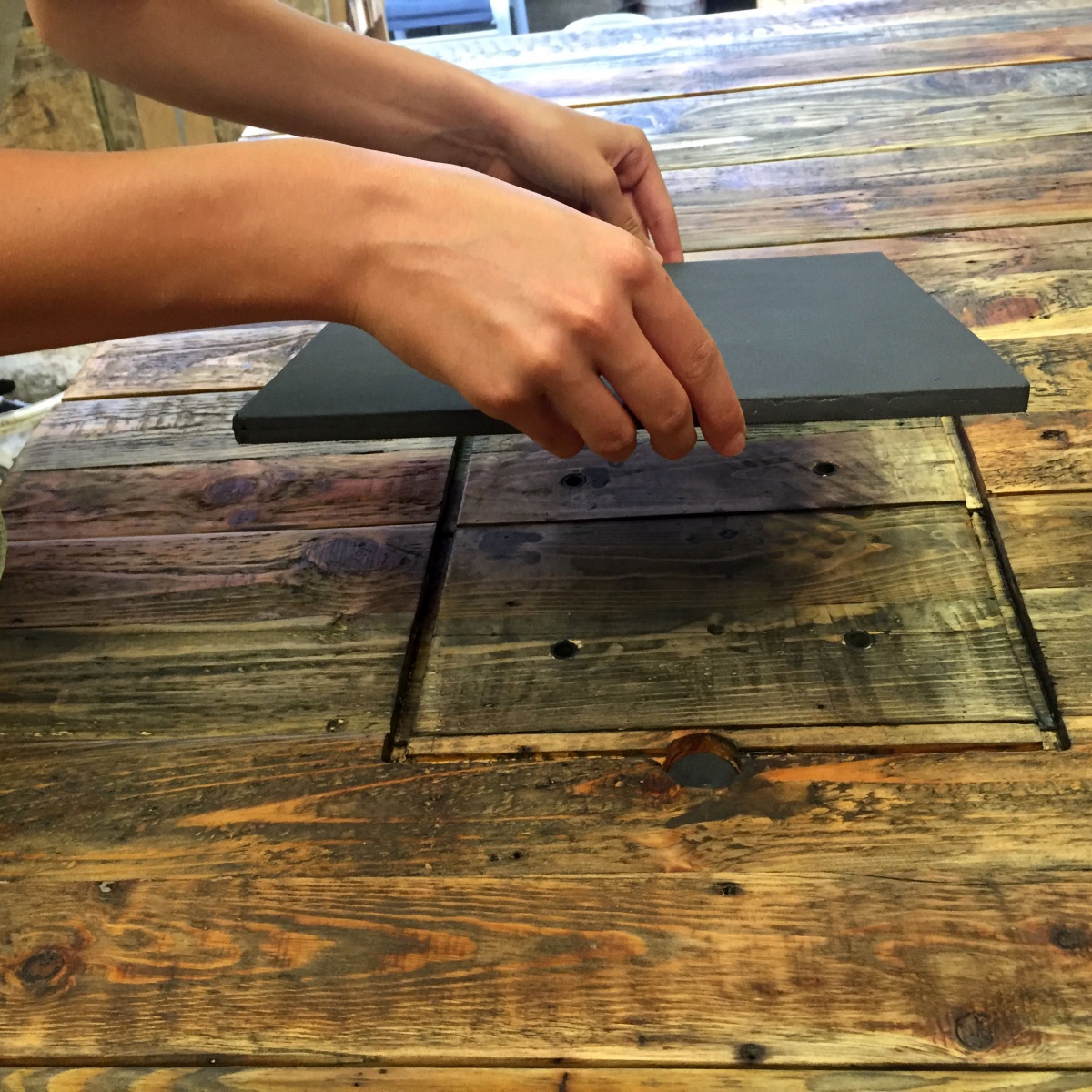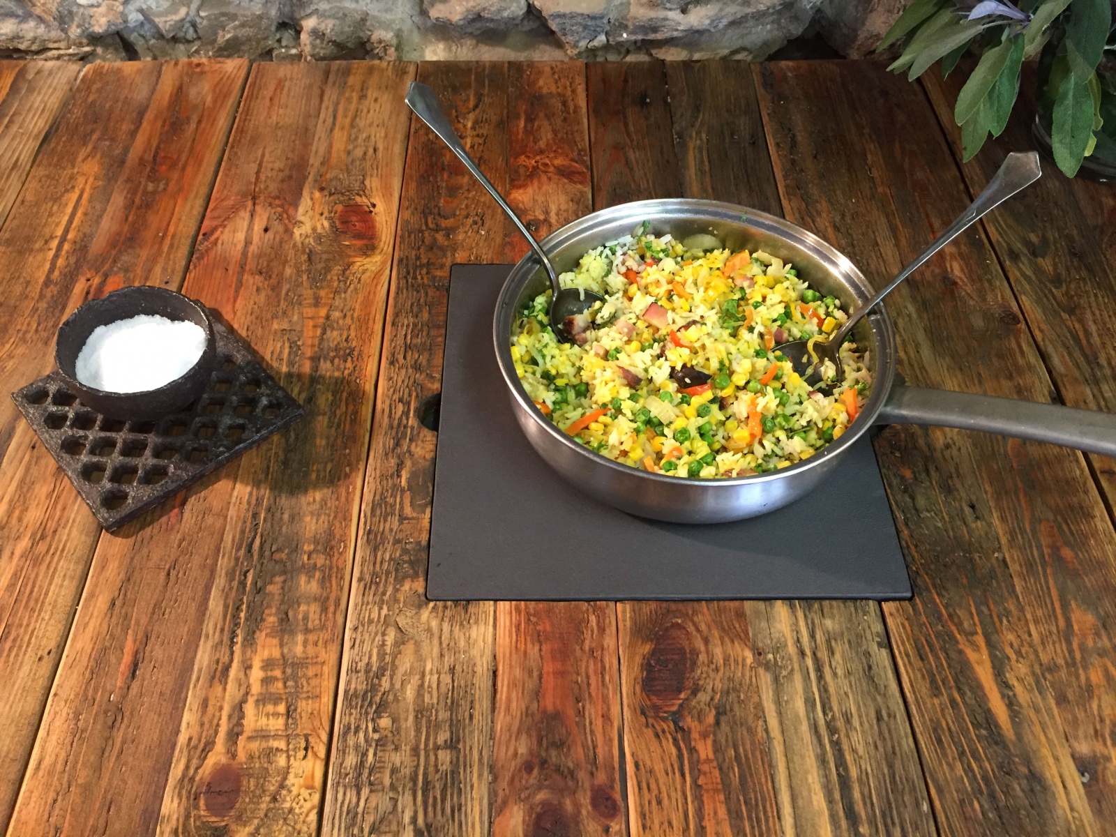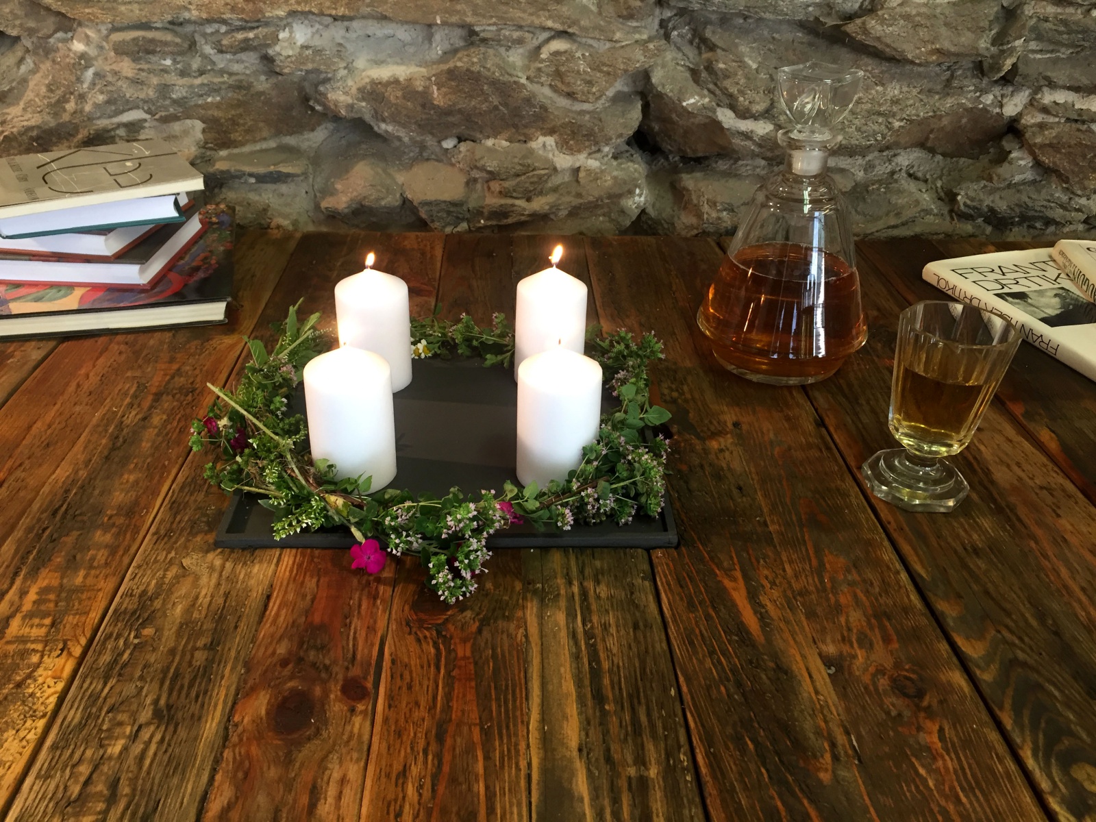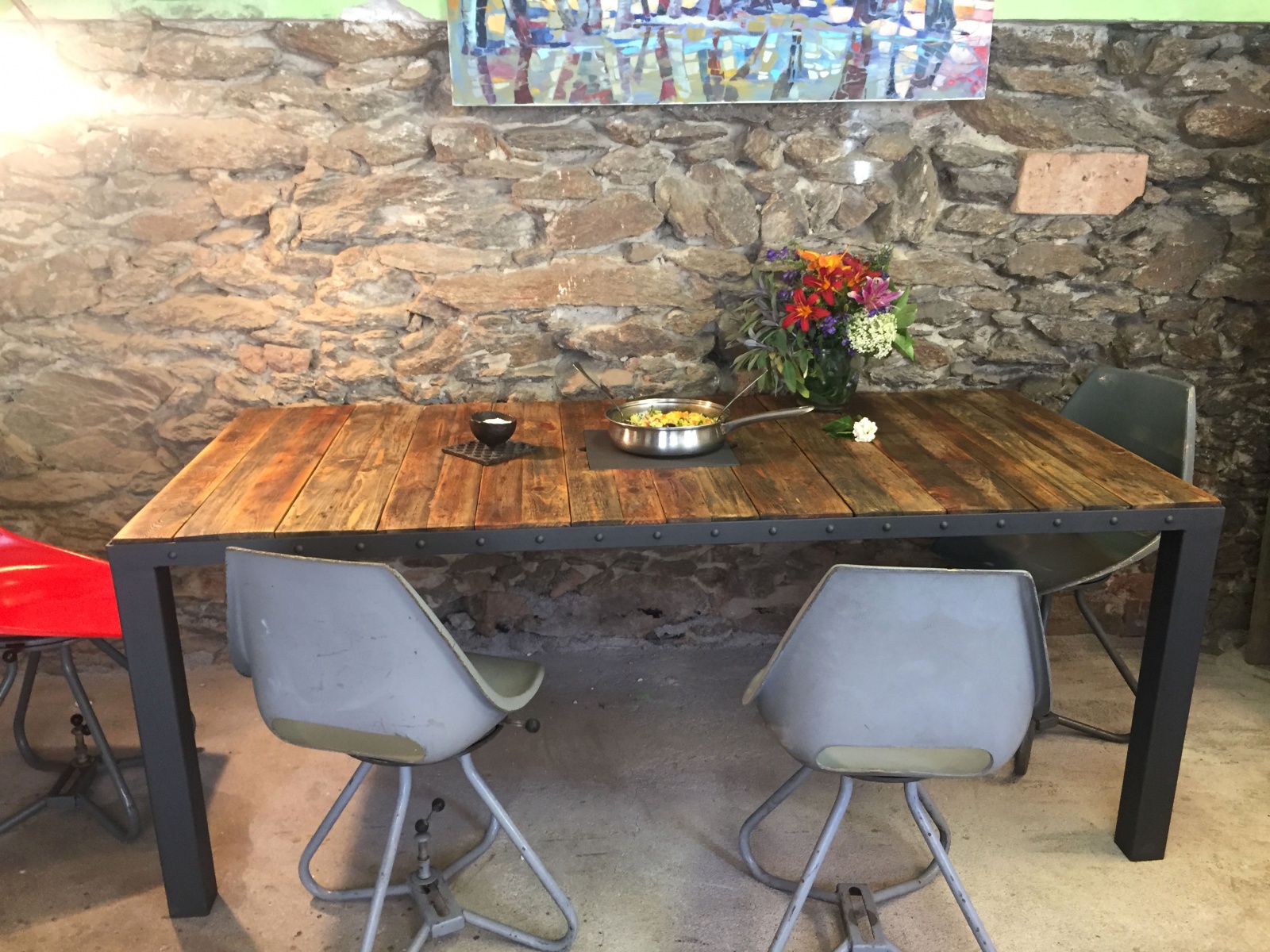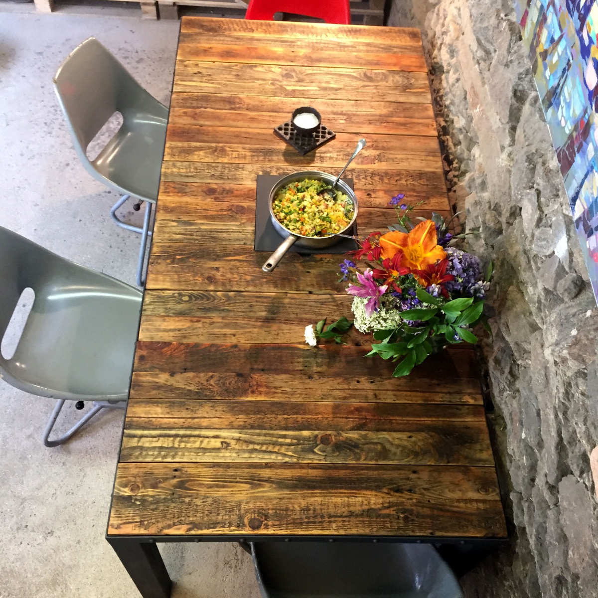Užité staré dřevo zpracované principem sendviče se ztraceným spojem. Ocelová kostra nýtovaná po obvodu. Nátěr kvalitní kovářskou barvou. Ve středu stolu vložená oboustranná kachle, která se jednoduchým otočením mění z podložky za svícen - nejen adventní. Kachle je natřená velmi kvalitní otěru a žáruvzdornou barvou.