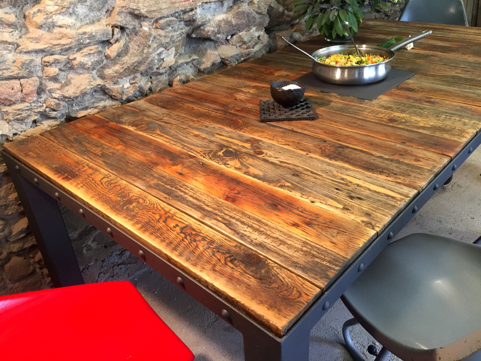 Užité, 30 až 70 let staré dřevo zpracované principem sendviče se ztraceným spojem. Sendvič je silný cca 4,8cm. Dřevo je ručně zpracované kartáčovaním, broušením, olejováním lněným olejem, voskováním včelím voskem s pigmentací. Nakonec zažehleno a zaleštěno. Tímto výhradně ručním zpracováním ponecháváme dřevu jeho historii, ale jeho povrch je hladký a dobře se udržuje.Ocelová kostra nýtovaná po obvodu. Nátěr kvalitní kovářskou barvou. Ve středu stolu vložená oboustranná kachle, která se jednoduchým otočením mění z podložky za svícen - nejen adventní. Kachle je natřená velmi kvalitní otěru a žáruvzdornou barvou. Rozměr vždy na míru, tento stůl v této ceně je v rozměru 200cmx95cm. +- 20% rozměru nehraje v ceně roli. Individuální rozměry naceníme zcela přesně, zákazník může žádat i svůj individuální design od tónu dřeva po osobní značku (např. do ocelové konstrukce nebo kachle). Cena vždy včetně dovozu po ČR.
