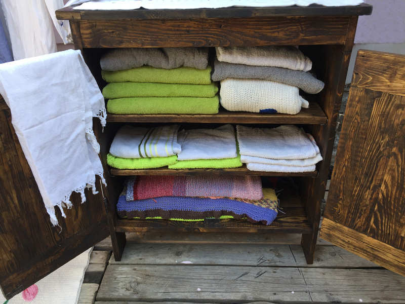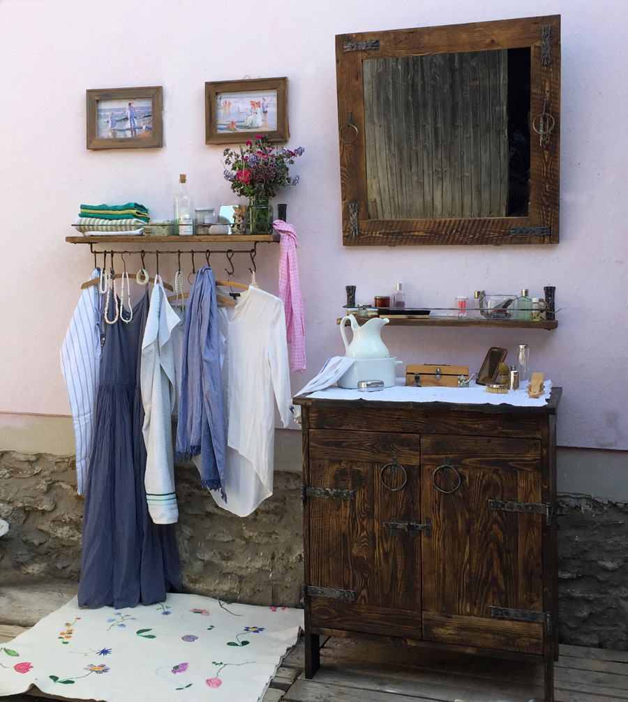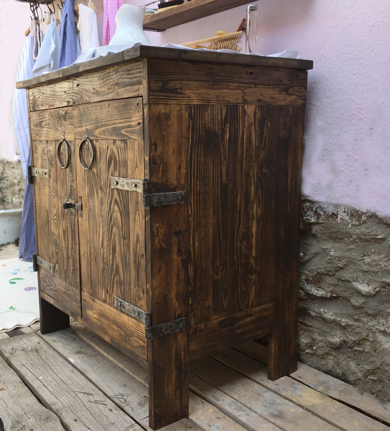 Staré užité dřevo ručně zpracované kartáčovaním, broušením, olejováním lněným olejem, voskováním včelím voskem s pigmentací. Nakonec zažehleno a zaleštěno. Tímto zpracováním ponecháváme dřevu jeho historii, ale jeho povrch je hladký a dobře se udržuje. Ocel je ručně kovaná, broušená, zažehlená a zaleštěná. Rozměr vždy na míru. Možno vyříznout otvor pro umývadlo dle šablony.