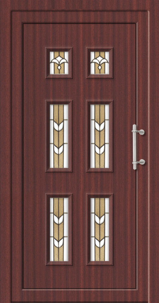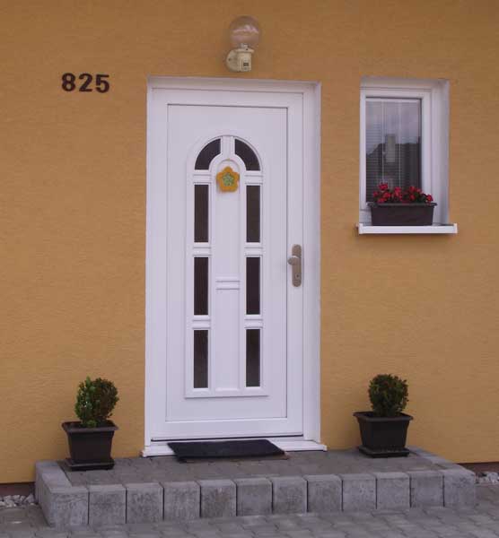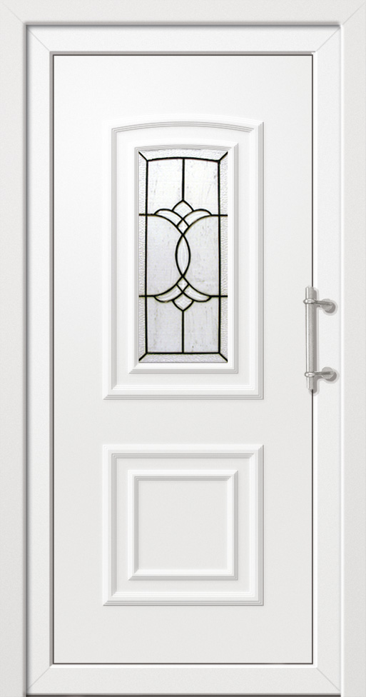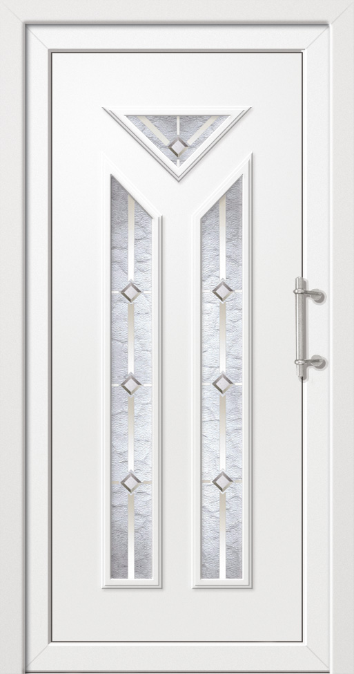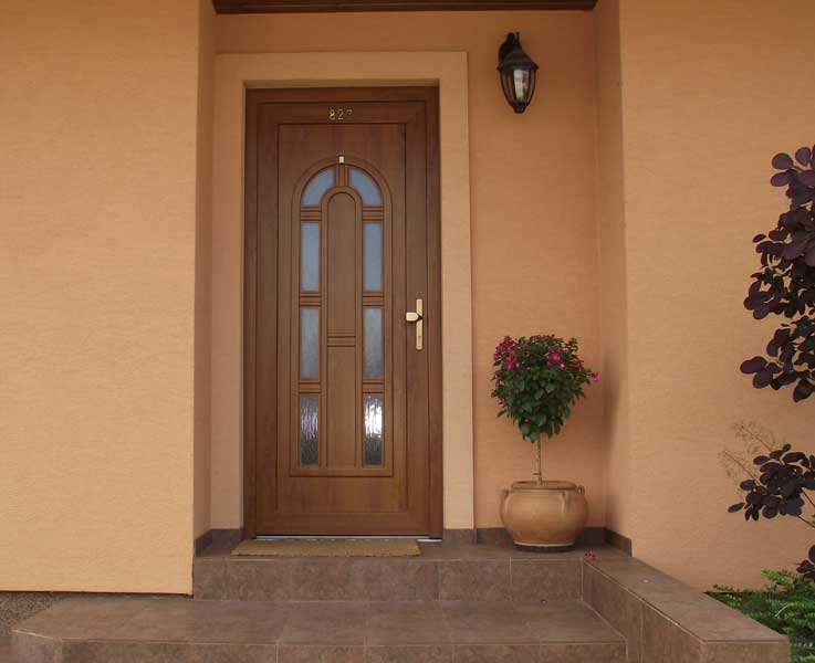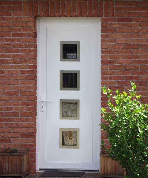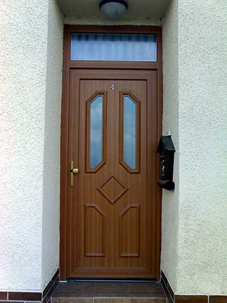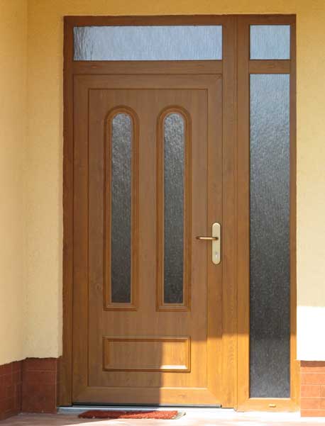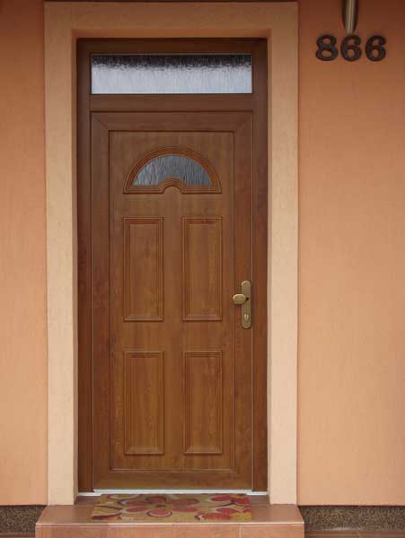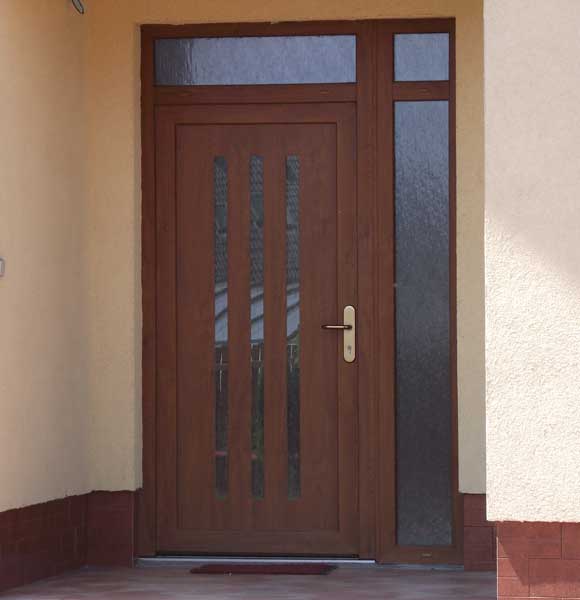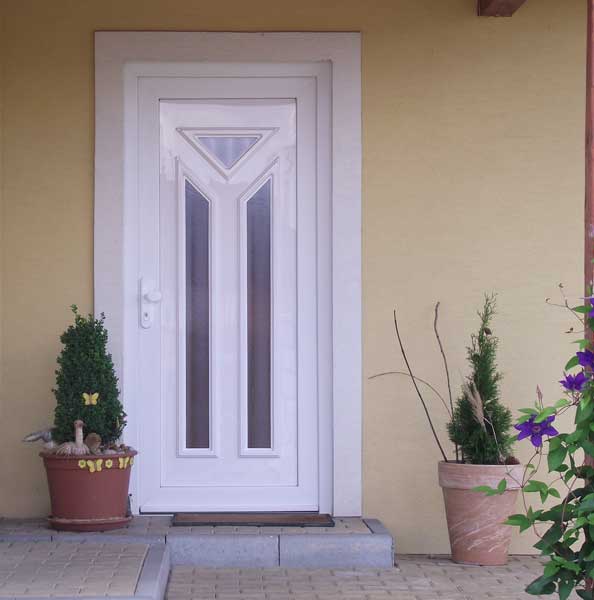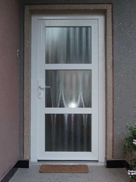 Vstupní plastové dveře Dveře členěny vložením ozdobné výplně