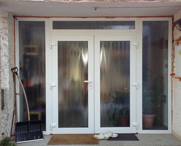Dvojkřídlé vstupní dveře s bočním pevným dílem Dveře členěny konstrukčními příčkami
