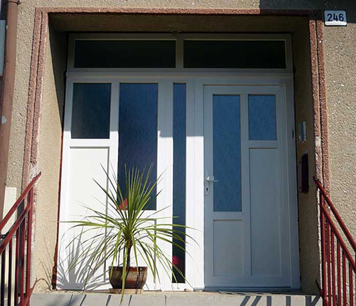 Dvojkřídlé vstupní dveře s nadsvětlíkem a bočními pevnými díly Dveře bez členění