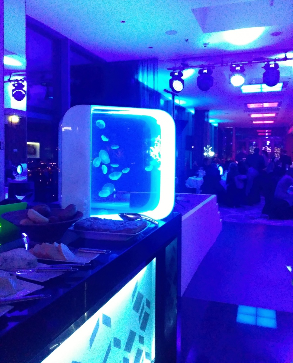 8 akvárií s medúzami rotujících na stolech ve VIP zóně v Cloud 9 sky baru v hotelu Hilton prague www.design-meduzy.cz