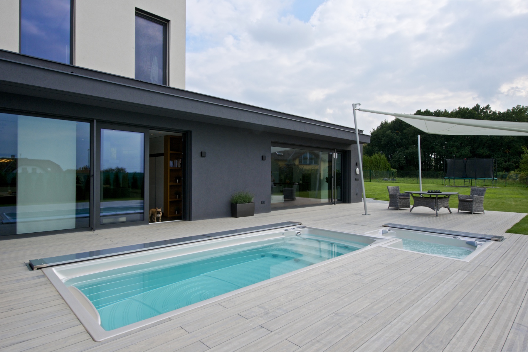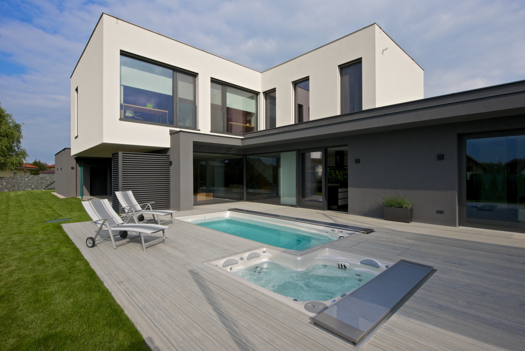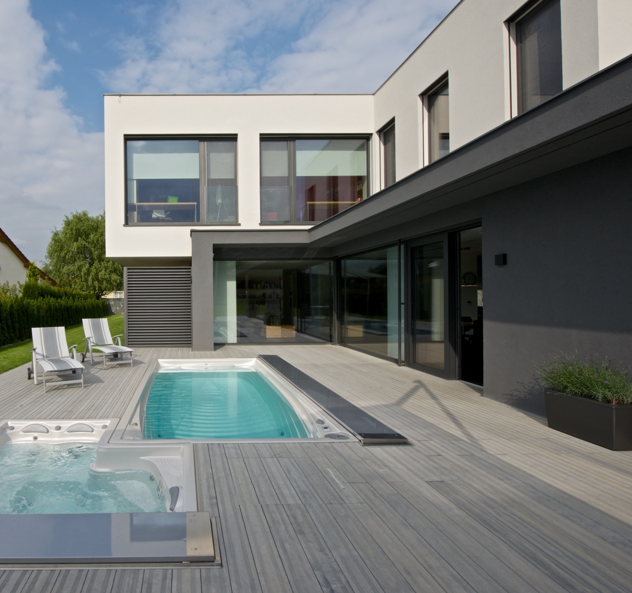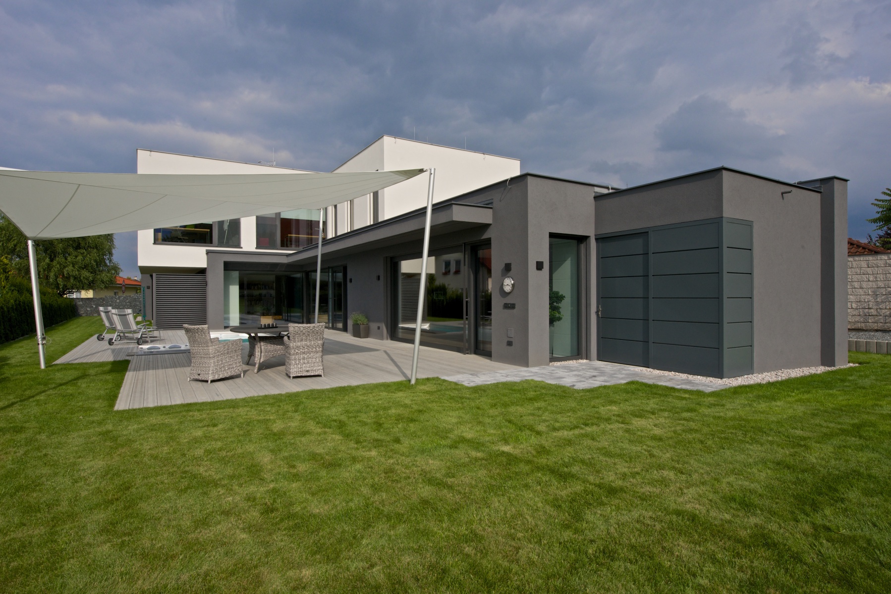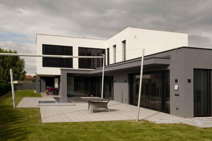 Nově instalovaná terasa Accoya®Deck v šedém odstínu u moderní novostavby v Praze 9 - ToTEM\n zdroj: totem-accoya.cz