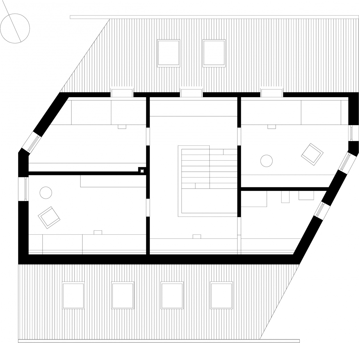 Po intenzivních jednáních s rodinou pak architekt vyvinul alternativní koncept řešení. Místo zastavění celého pozemku dvěma samostatnými budovami, které se pak přesto budou muset nějakou formou stavebně spojit, byl architekt Troy přesvědčený o tom, že je vhodnější spojit oba požadavky do jednoho kompaktního stavebního tělesa – tedy bydlení pro rodinu a prázdninové byty pro hosty. Juri Troy je známý citlivým začleněním svých budov do krajiny. Z výškového rozdílu a dvou příjezdových komunikací učinil projektant z nouze ctnost. Navrhl celkem čtyřpodlažní budovu. Ve výšce horní příjezdové komunikace se nachází přízemí (úroveň nula) se vchodem do privátní obytné zóny rodiny Finkových, která se dělí na dvě nejhornější úrovně. Schodiště funguje jako centrální jádro domu, kolem něhož jsou uspořádány obytné místnosti.