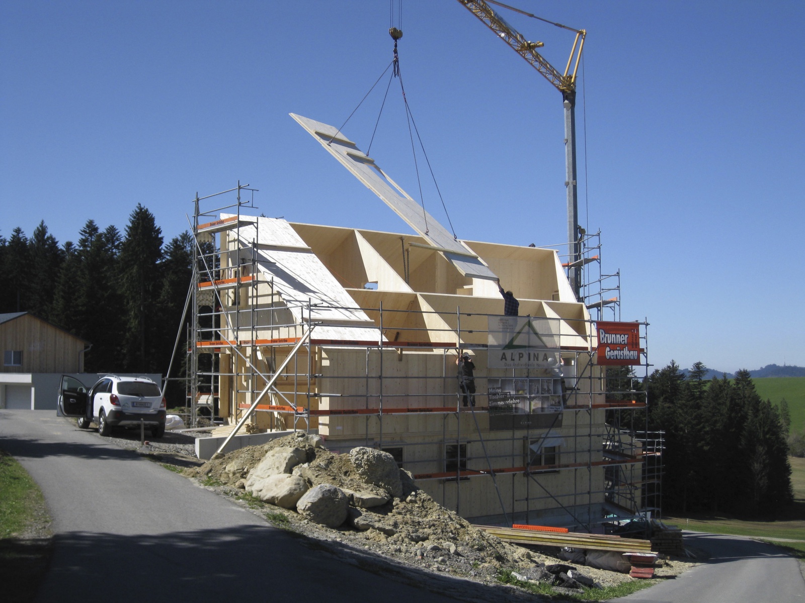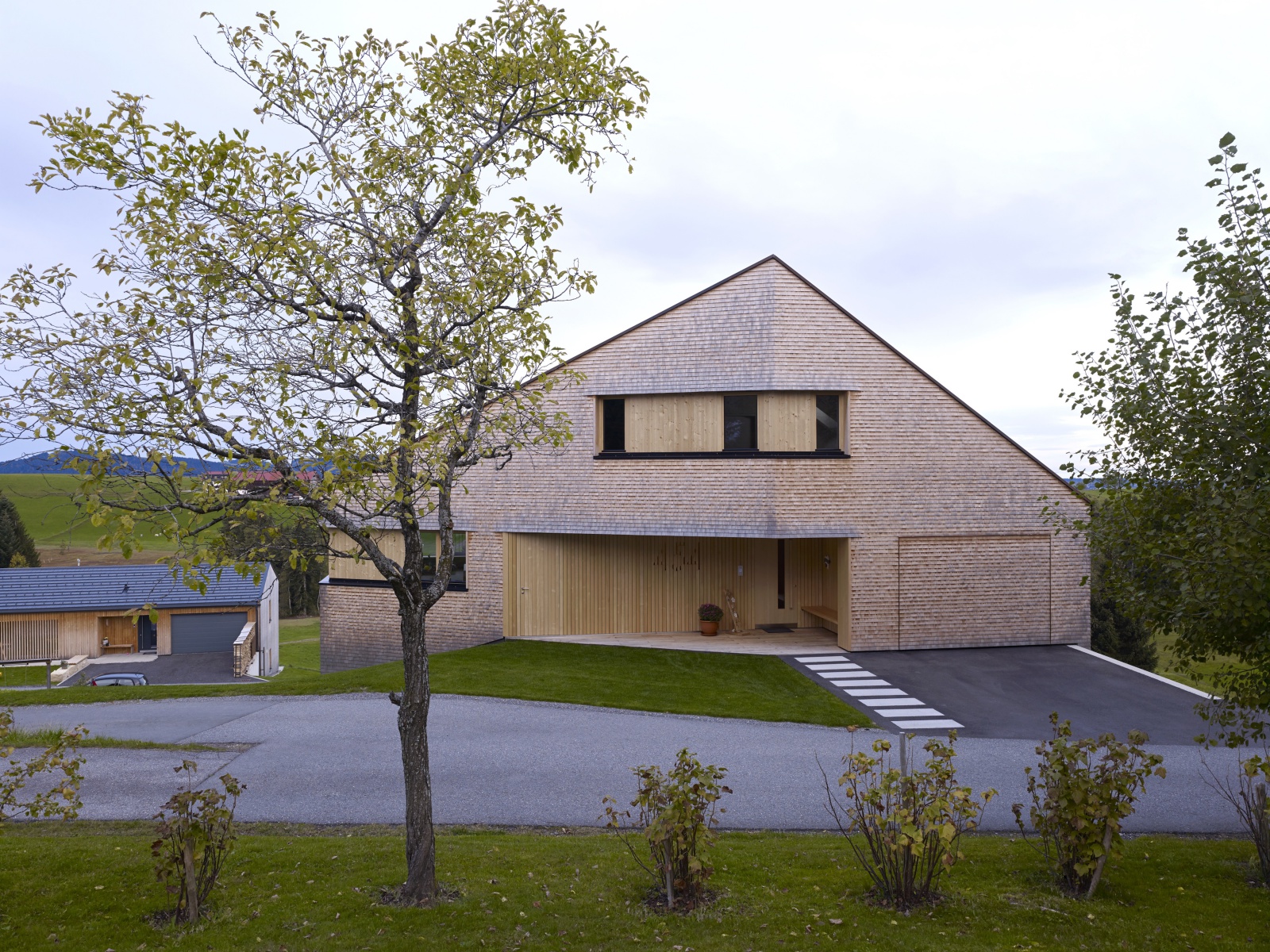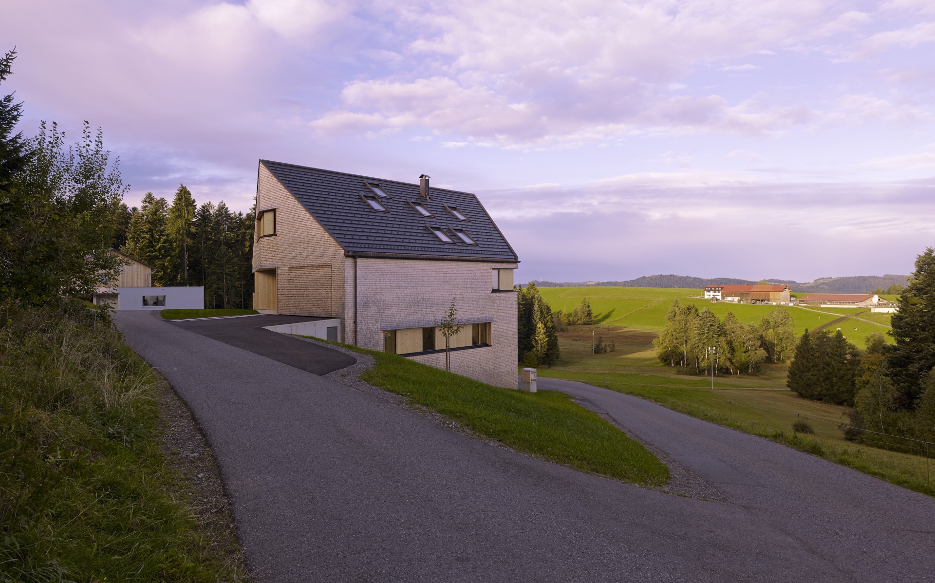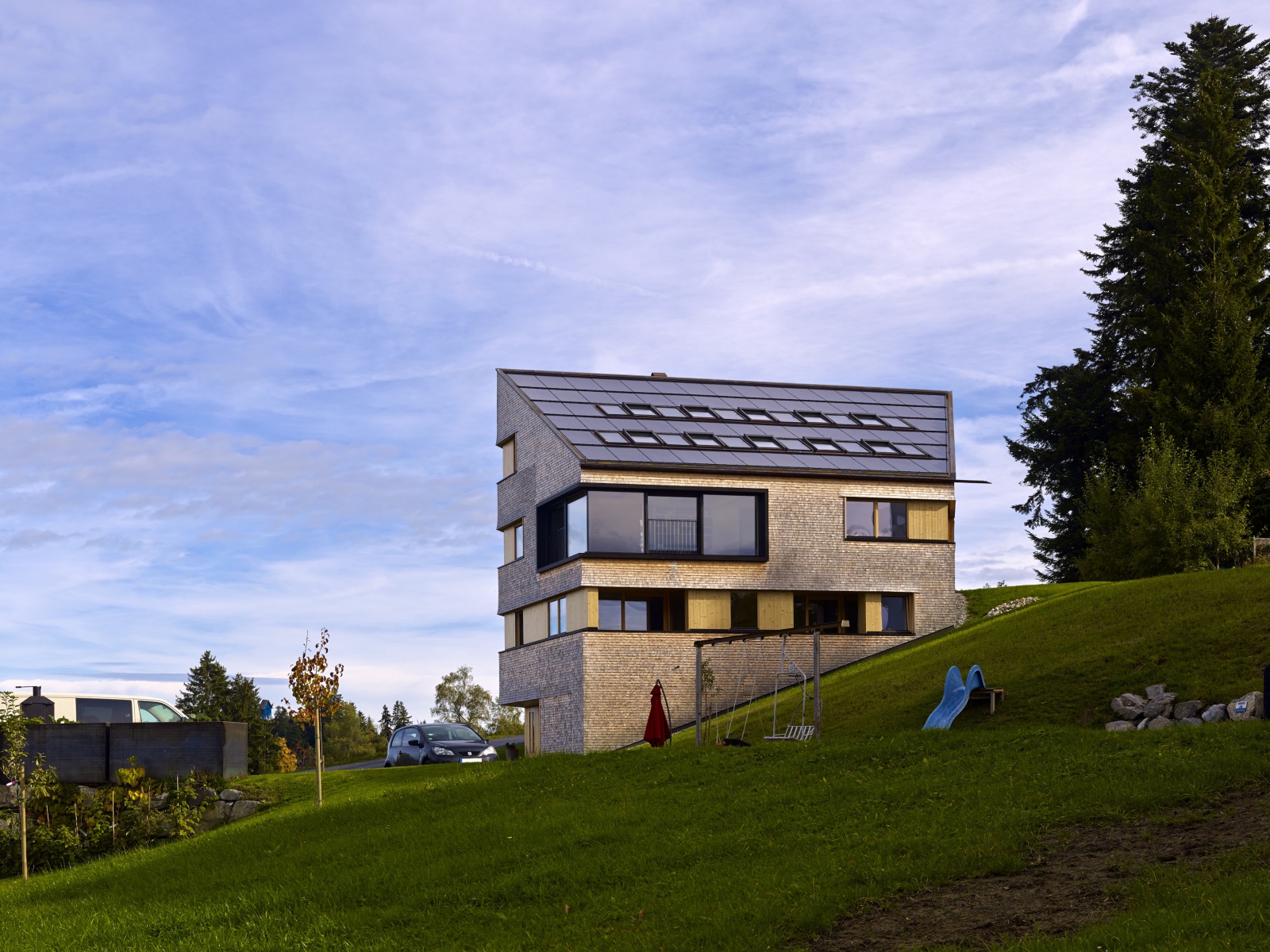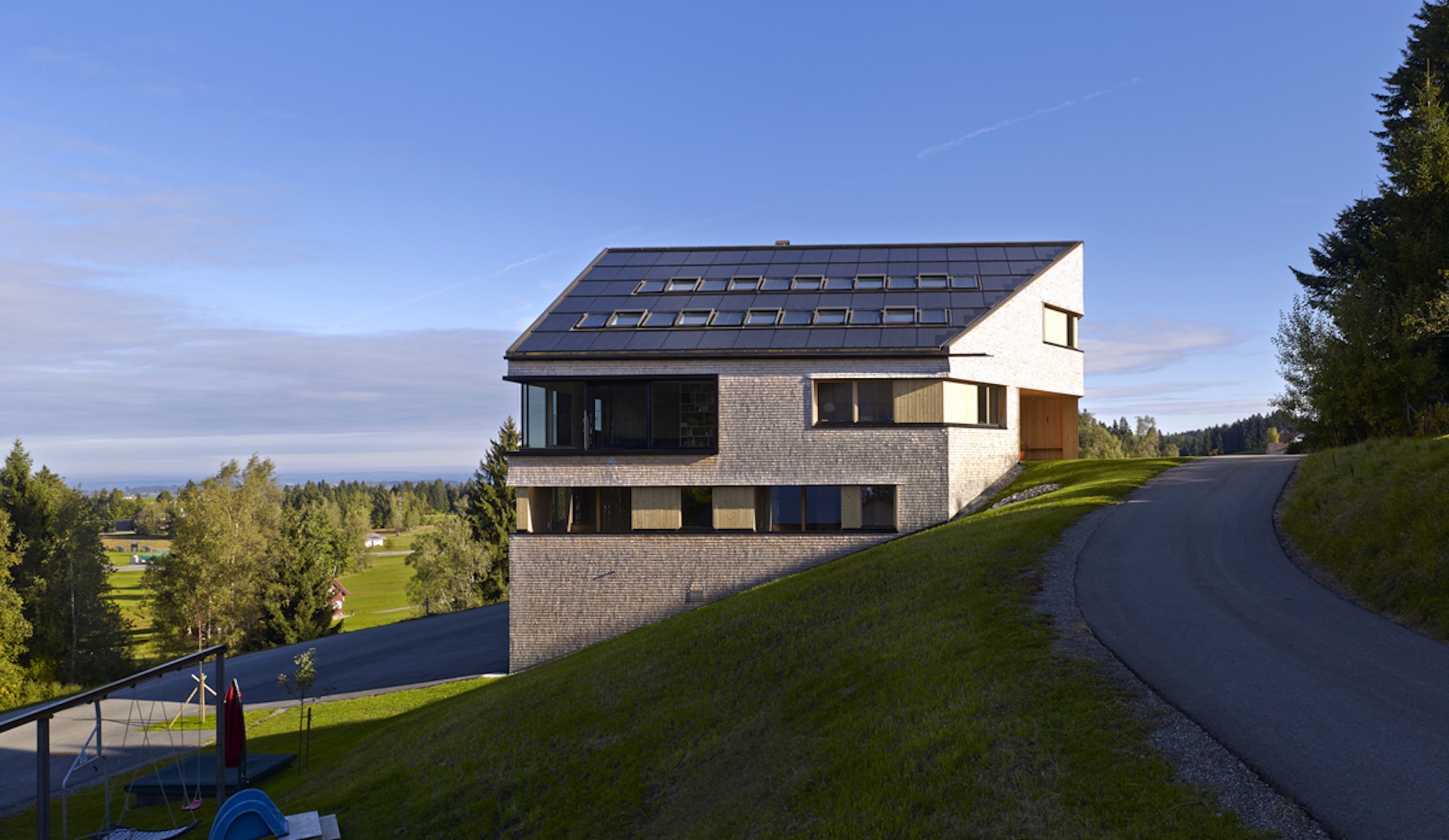 Rodina se dvěma dětmi si chtěla postavit jak rodinný dům, tak také sousední budovu pro prázdninové byty v bezprostřední blízkosti rodinného domu. Pozemek představuje extrémní výzvu: nejedná se o stavební pozemek v běžném smyslu, je možné jej popsat spíše jako svahovou hranu mezi dvěma příjezdovými komunikacemi. Na druhé straně poloha nabízí krásný, dech beroucí výhled na pitoreskní svět hor hřebene hory Pfänder. Je téměř zbytečné zmiňovat, že se toto místo nachází v oáze absolutního klidu a je možné je označit jako „ryzí idyla“. Abychom ještě jednou vysvětlili stavební výzvu: na délku rodinného domu činí výškový rozdíl více než 6 metrů. Zpracováním návrhu pověřila rodina architekta Juri Troye, který již v četných projektech prokázal, jak je možné dosáhnout s obtížně zastavitelnými pozemky nekonvenčního a přesto optimálního řešení.