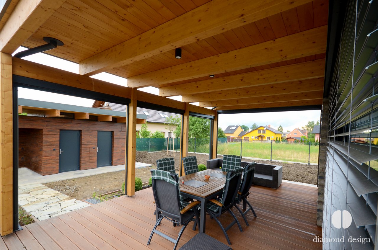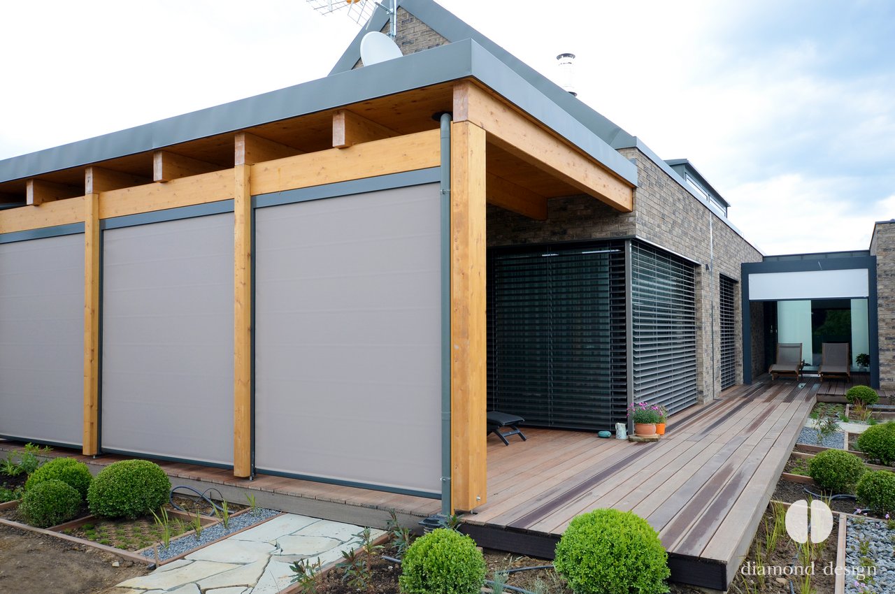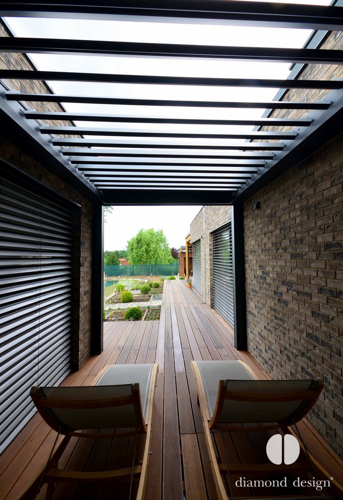 Realizace pergoly vznikla ve spolupráci s arch. kanceláří Janda & Zezula. Přáním investora bylo zastřešit venkovní prostor s bazénkem při vstupu ze sauny a zajistit boční ochranu před větrem.