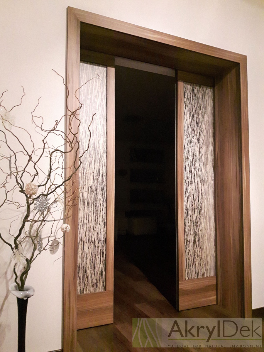 Posuvné dveře v interiéru - dekor ořech, dveřní výplň tvoří akrylátové sklo se zalisovanými rostlinami. Použitý materiál: Dekorakryl