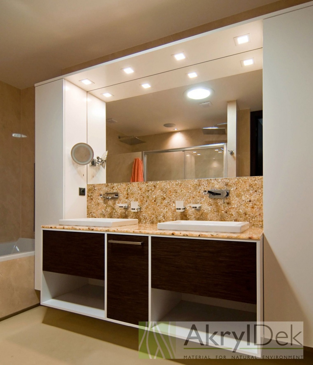 Netradiční koupelnový obklad a deska pod umyvadlo z říčního kamene, vkusně oživí interiér moderní koupelny. Použitý materiál: DEKORAKRYL Realizace Acer Interier S.r.o.