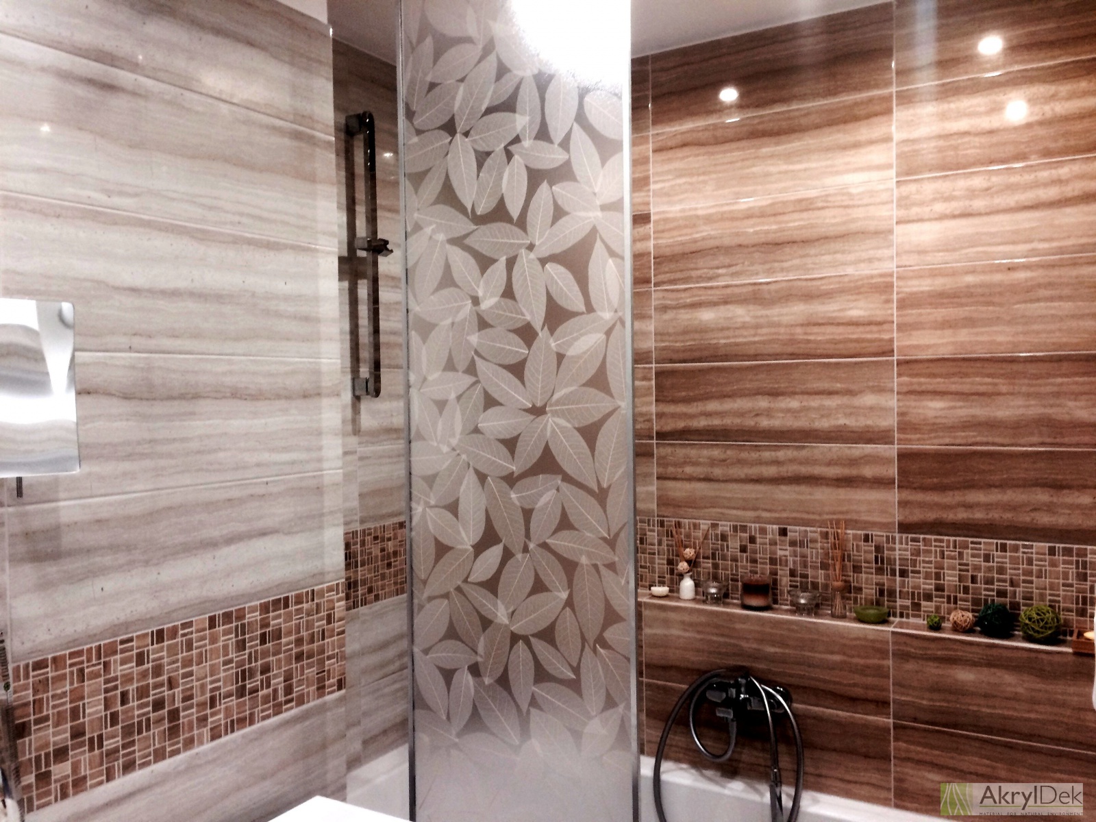 Posuvná zástěna do sprchy a vany s přírodním motivem listů. Použitý materiál: DEKORAKRYL