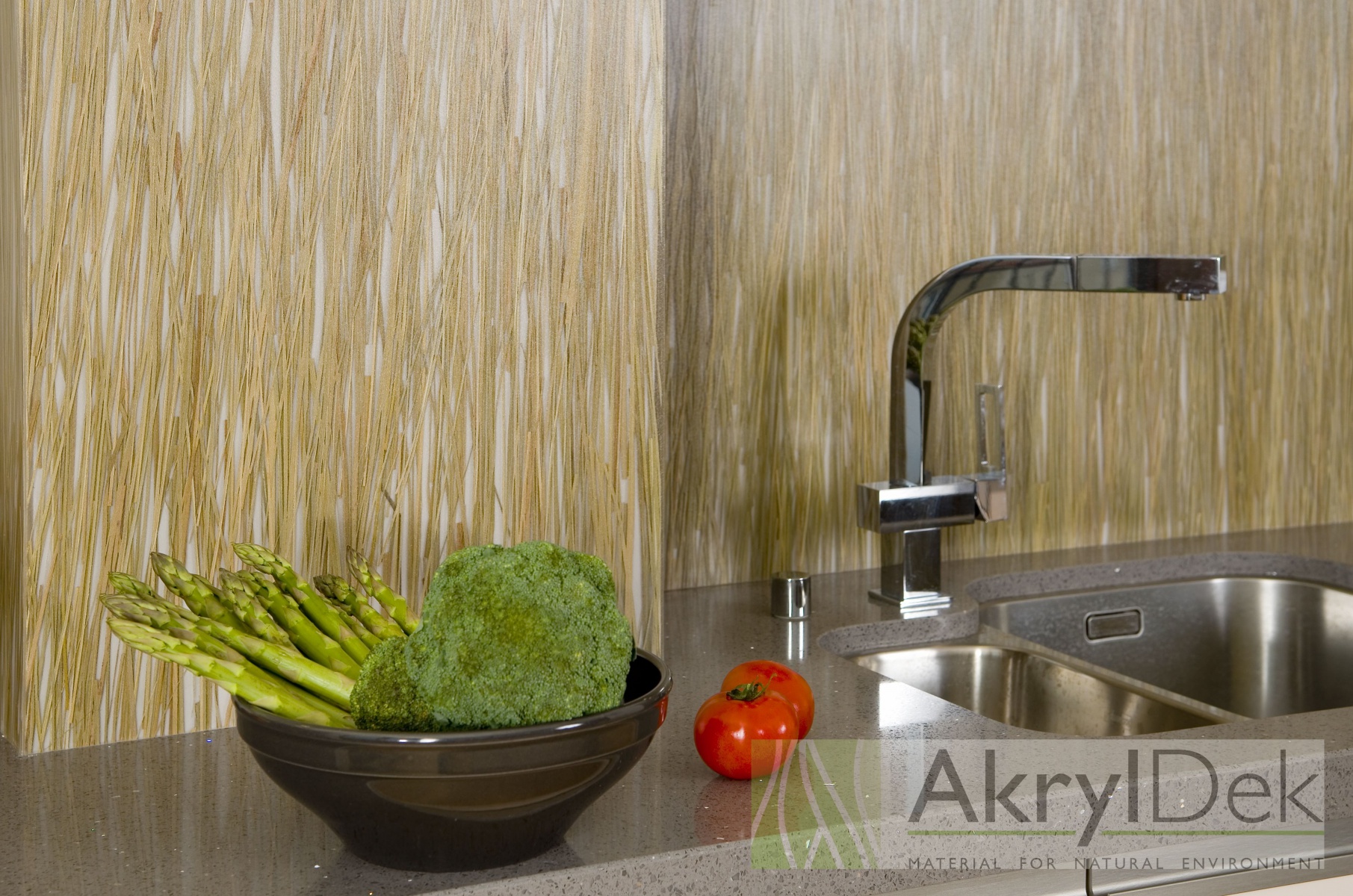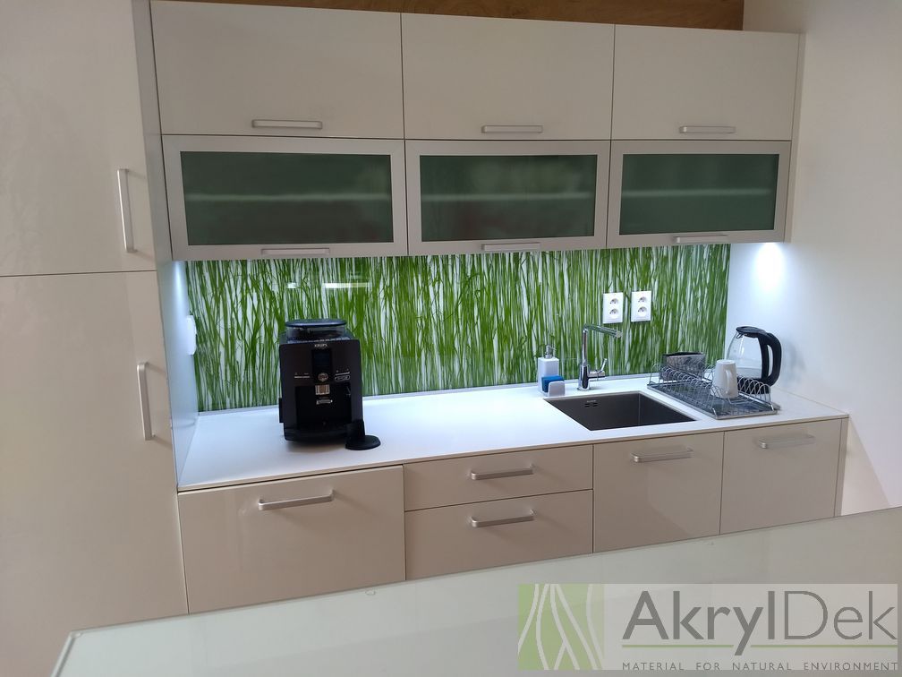 Kuchyňský obklad s výplní zelené trávy v akrylátovém skle. Použity materiál: DEKORAKRYL