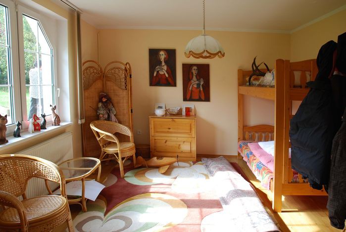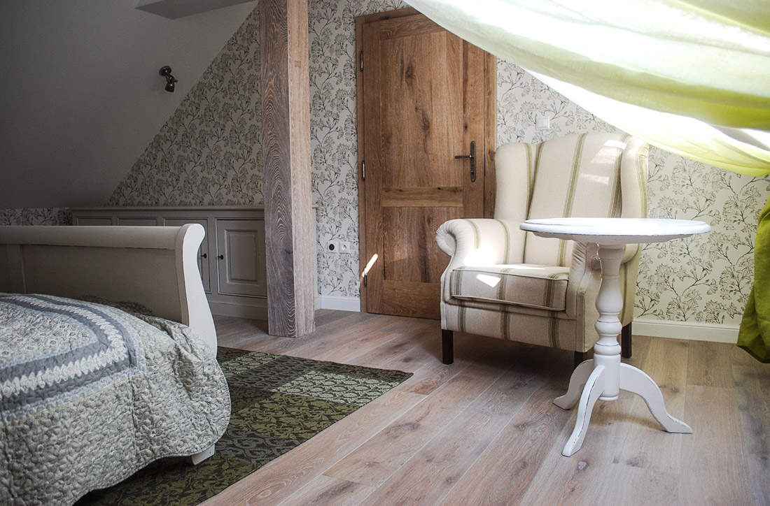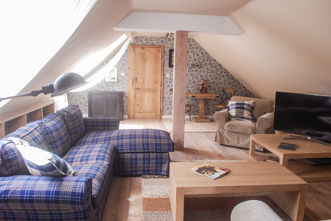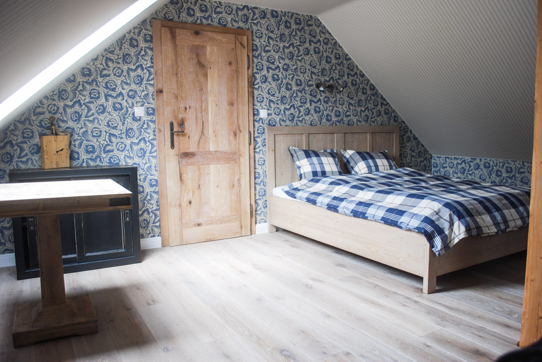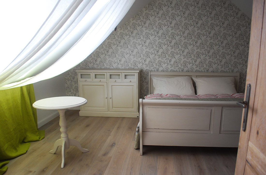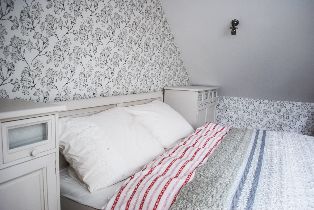 Původně zde chtěli mít majitelé ještě jednu postel, aby bylo kam uložit všechny hosty, nakonec jsme ji ale nahradili stolkem a postel jsme přestěhovali do zadní malé místnosti.