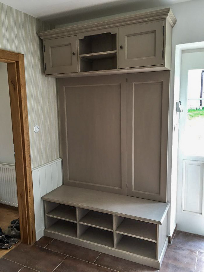 Podlahu jsem doladila do nádherné dlažby připomínající měděné pláty, je sice z OBI, ale parády udělá opravdu hodně. Ráda kombinuju levnější materiály objevené ve stavebních marketech se značkovými doplňky, tím vzniká ta správná kombinace, která nakonec vypadá často velmi luxusně a originálně. Největší proměnou byla výměna dveří původních bílých z lamina za krásné a kvalitní dřevěné, následně jsme celou místnost nechali pobít zdobnými palubkami, které tak krásně zůtulňují a navíc konstrastují s použitými tapetami. Botník dělali naši truhláři opět na míru.