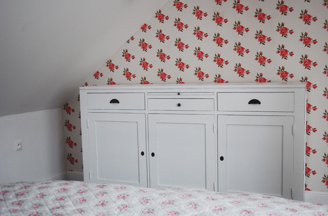 A právě k této jemné tapetě mocca barvy jsem vybrala hravou červenou kytičku na protější stranu, která se v mírné obdobě opakuje i na vzoru přehozu přes postel. Skříňka je D565 v barvě Bílá na Taupe.