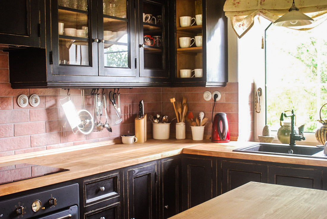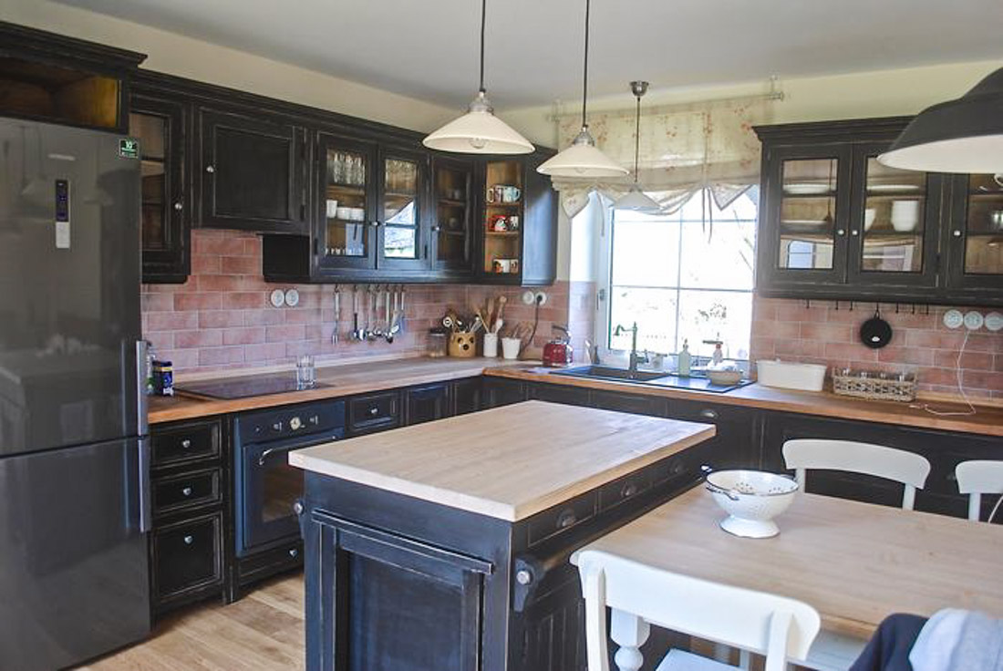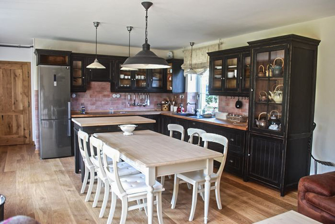 Obklad kuchyně je cihličkový a deska z masivního jasanu. Také všechny spotřebiče jsem ladila do černé nebo antracitové barvy - jako dřez, lednici, baterii, troubu.