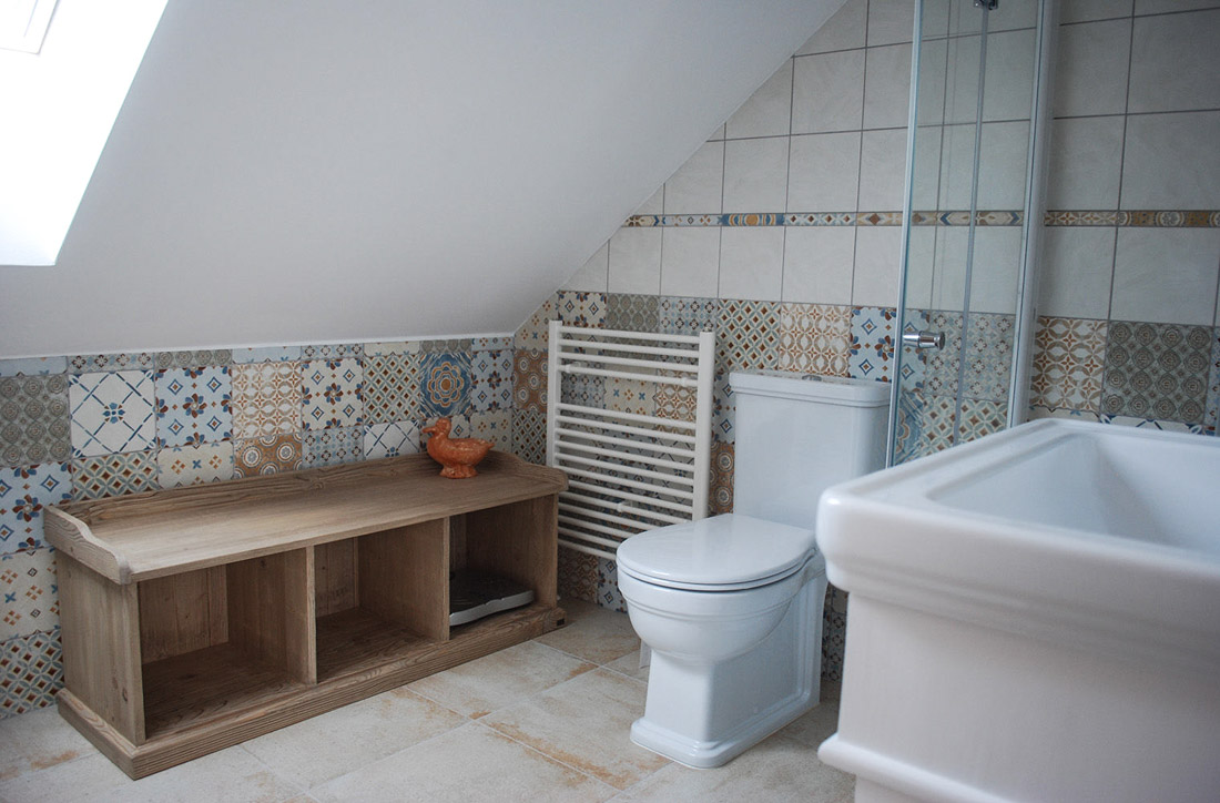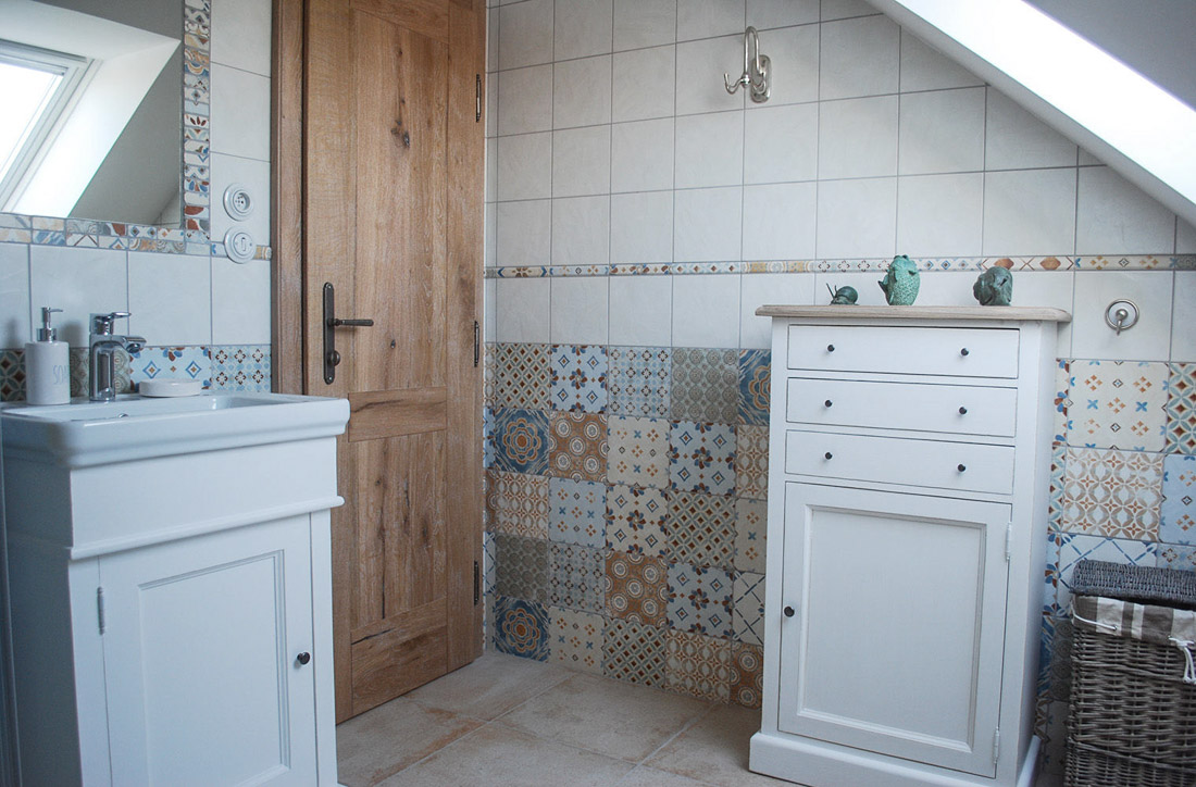 Koupelnu jsem toužila udělat v mírně rustikálním stylu a sháněla jsem obklady a dlažbu po celé Praze, až jsem nakonec narazila na italské obklady, které mě natolik zaujaly, že jsem si sem už jiné představit nedovedla. Protože nám je ale nedokázali v obchodě nabídnout rychle, objednali jsme si je sami. Tento obklad je tedy od nynějška na objednání u nás na prodejně. Má neuvěřitelných 27 různých dekorů, které k sobě krásně ladí, k tomu obkladové pásky a základní bílou, rozměr je 20x20cm.