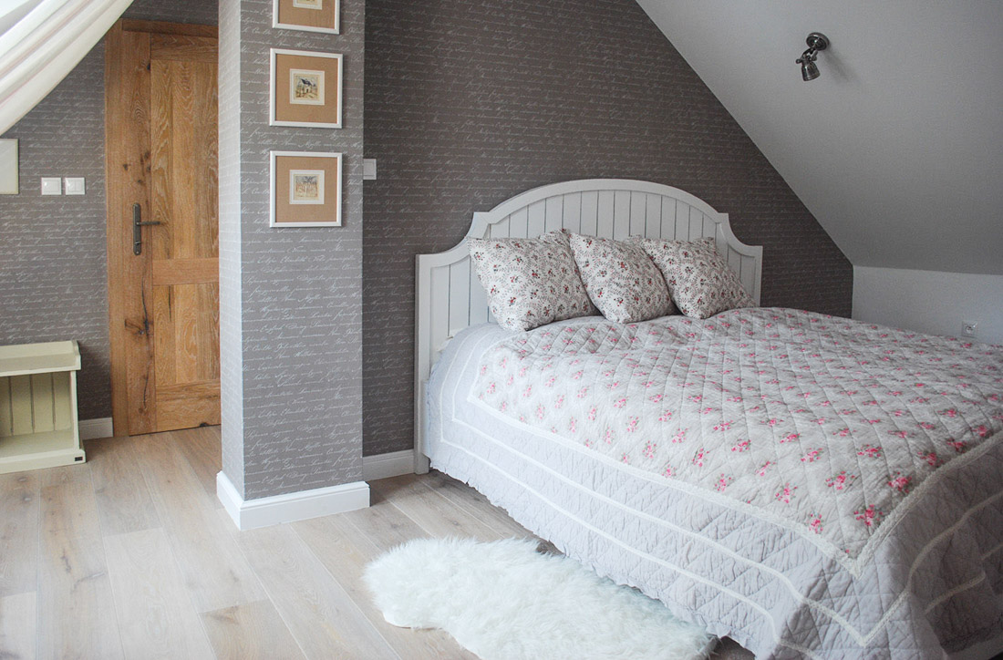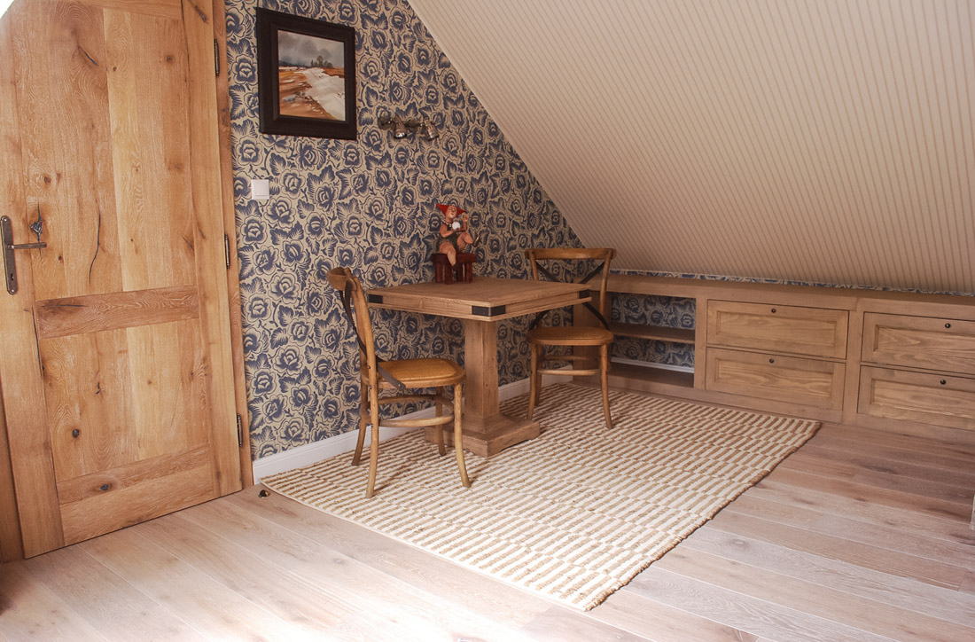 Zdi nám krásně spojuje květovaná modrá tapeta s béžovým proužkem na šikminách. Kvalitní dveře a podlahy dodávají luxusní vzhled. Karetní nebo hrací stolek v barvě přírodní kartáčované dřevo. Pod šikminami police na míru v podobném provedení.