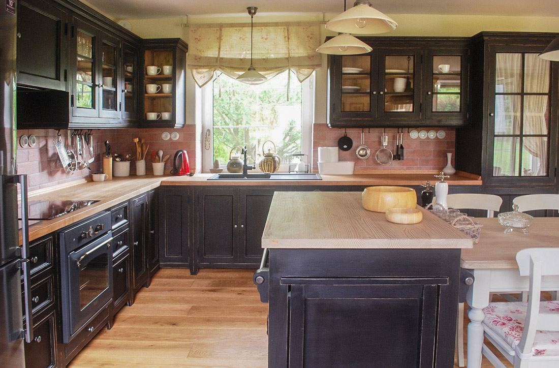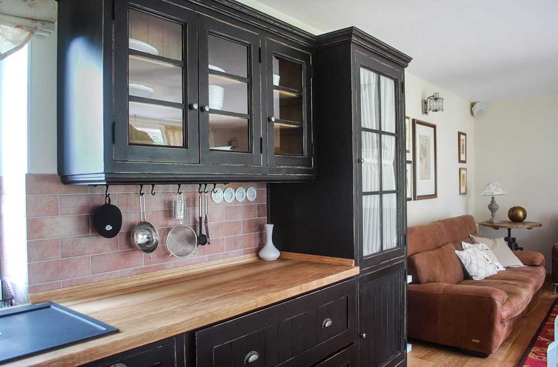 Kuchyň je v barvě černá antik, což znamená, že rohy jsou obroušené na dřevo a opatřené postaršovacím voskem, interiéry skříněk jsou v barvě dřeva a sešikmené okno jsme částečně zakryli římskou roletkou z látky od Kate Forman.