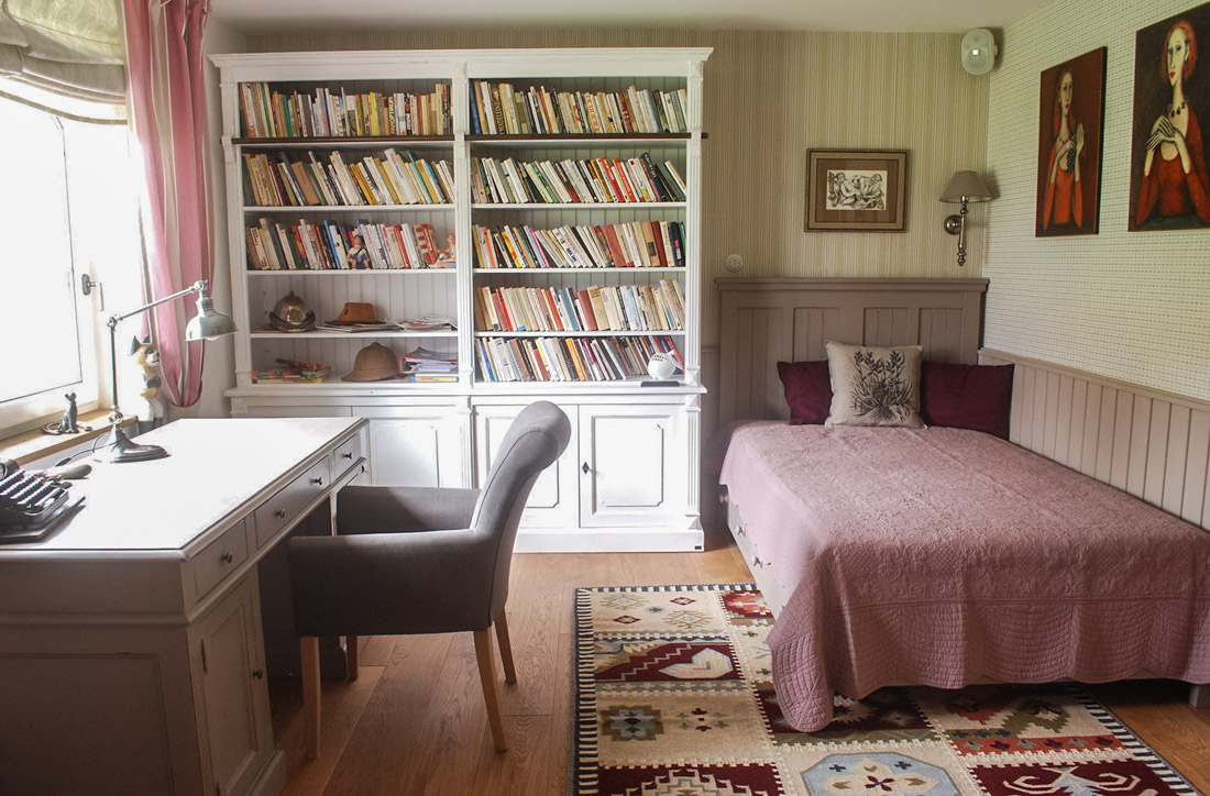 Do nové pracovny se přestěhovaly už jen dva obrazy, zbytek strého nábytku pohltili místní zájemci či sběrný dvůr. Z nábytku jsme zde umístili knihovnu D158, pracovní stůl D588, křeslo DT02 a do rohu lůžko k odpočinku D633. Lampička na pracovním stole Bonnie a na okně rolety a závěsy z látek od Kate Forman. A tak jsme mohli vytvořit pracovnu novou, elegantní, dát prostor knihám a majitelce tak vytvořit krásný pracovní kout se stolem, od kterého je navíc krásný výhled do zahrady.