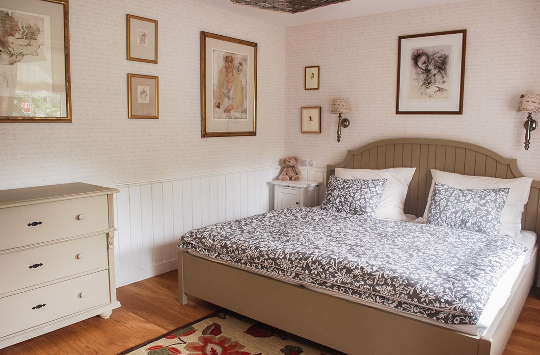 Proměnou ložnice jsme získali velmi útulný prostor, majitelka miluje grafiky, a tak jsem vybrala jen takové, které na mě pozitivně dýchly a nenarušovaly snovou atmosféru této místnosti.