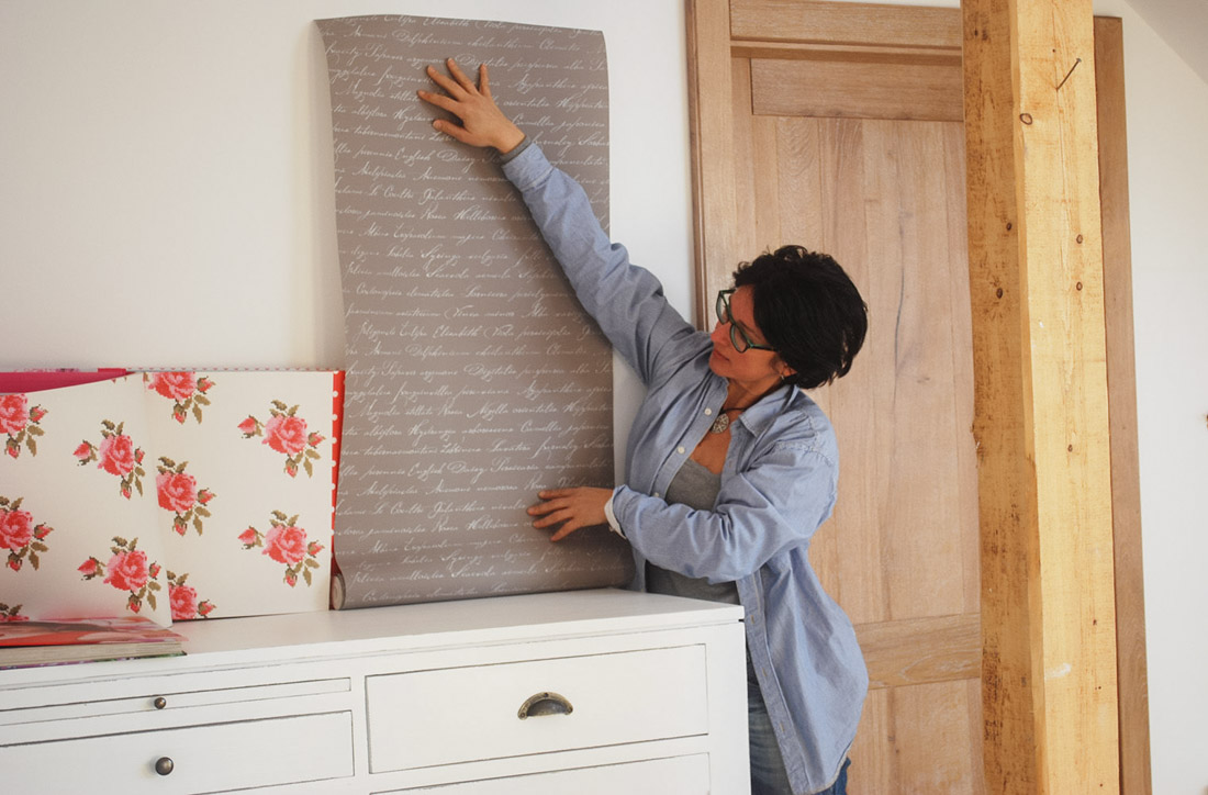 Stěny jsme nechali potapetovat klidnou krémovou tapetou s písmenky od firmy Esta a obložit spodní část palubkami. O tyto práce s postaral pan Hůrka.