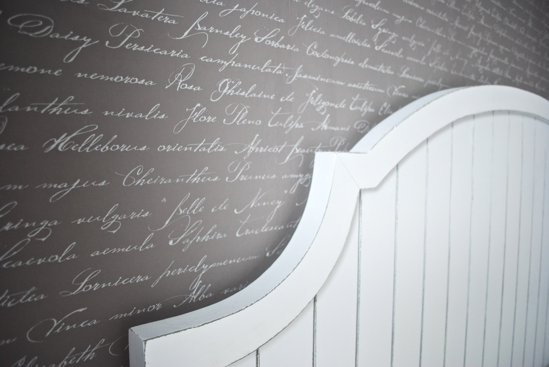 Tenhle pokoj je asi můj nejoblíbenější, tapeta v barvě café au lait s ležatým písmem a k tomu jemně červená barva v dekoru látky na posteli a na protější zdi na tapetě.