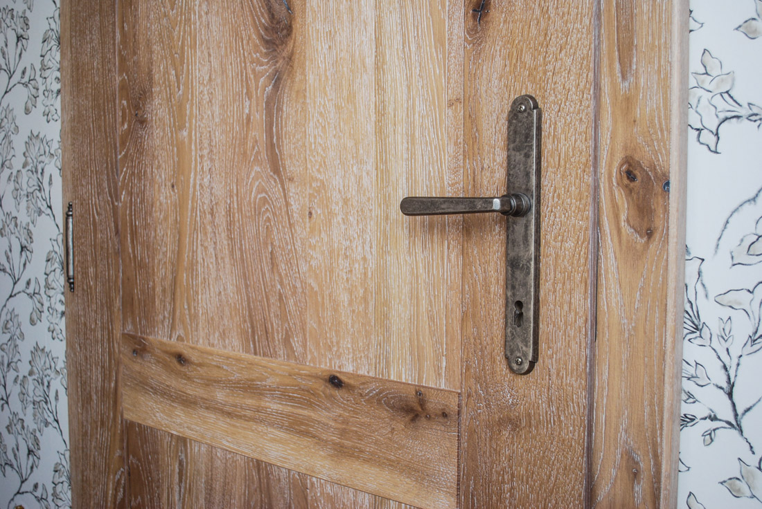 Překrásné kartáčované dřevěné dveře otevírají pohled do nových poojíků: