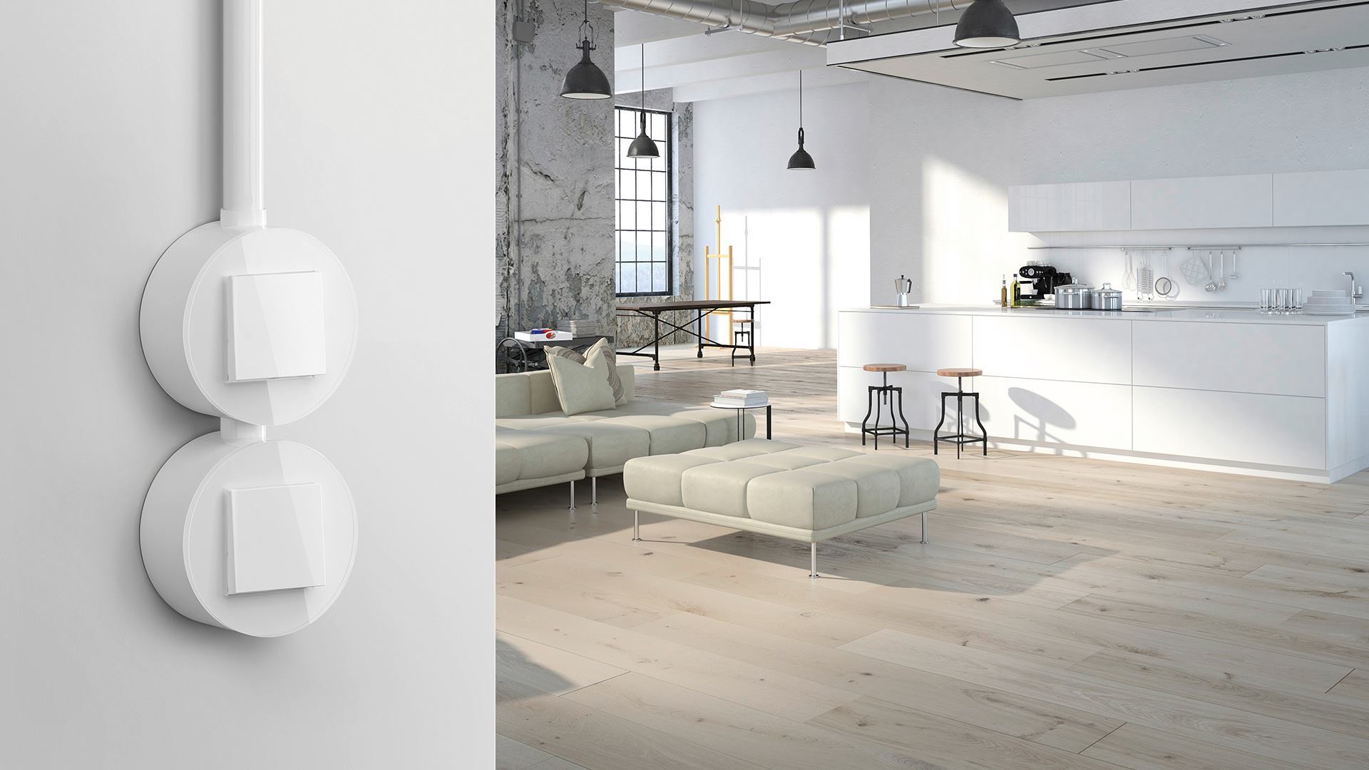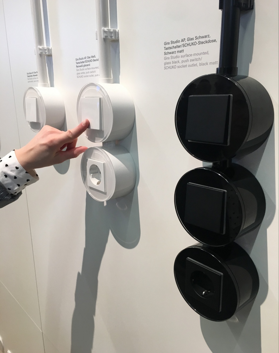 Vypínačový program Gira Studio - skleněný kulatý rámeček v černé nebo bílé barvě na povrch nebo do zdi