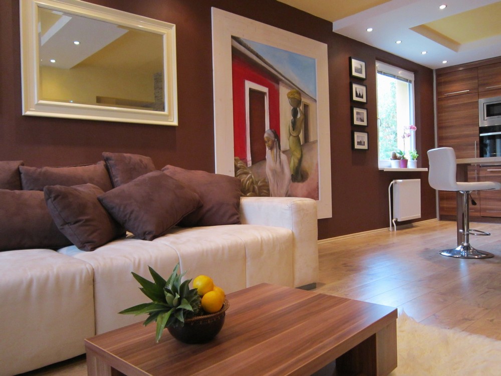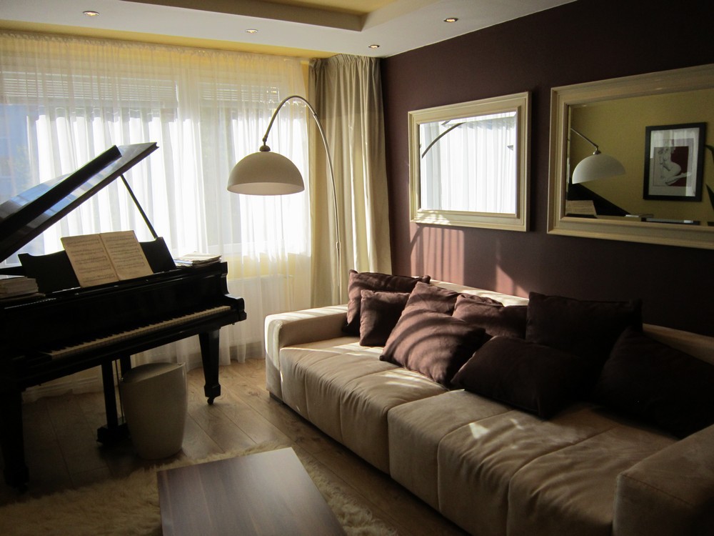 Pokoj opticky zvětšují zrcadla s rámy v krémové barvě stejně jako sedačka a závěsy. Závěsy jsou umístěny na neviditelných konzolách, tento netradiční způsob zavěšení vždy přitahuje pozornost.