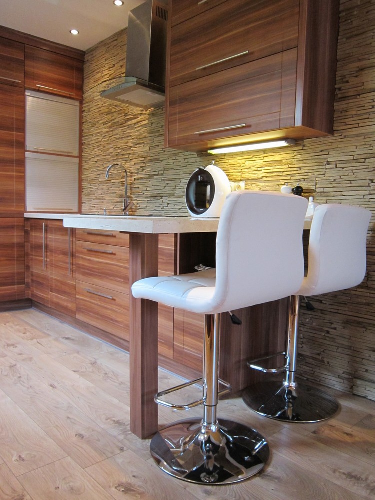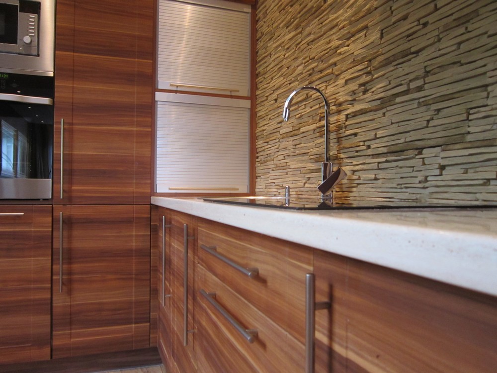 Na pracovní desce jsme využili maximum prostoru instalací roletek. Za pracovní linkou je užita imitace přírodního kamene, která je jednotícím prvkem celého interiéru. Obklad je opatřen speciální voděodolnou impregnací.