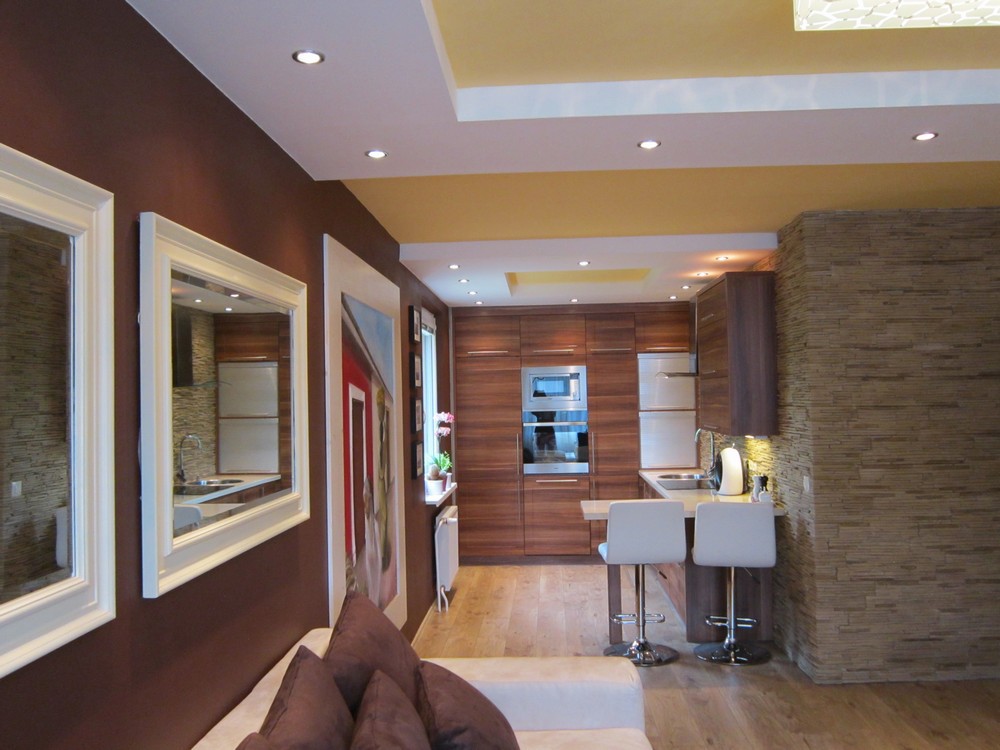 Obývací pokoj s kuchyní je postaven na kontrastu tmavých a světlých barev. Vzhledem k tomu, že místnost je poměrně úzká, opticky jsme ji rozšířili a zesvětlili umístěním dvou zrcadel nad sedačkou. Nevšednost celému prostoru dodává klavír a sádrokartonový podhled ve tvaru čtverce, který koresponduje s originálním stropním svítidlem.